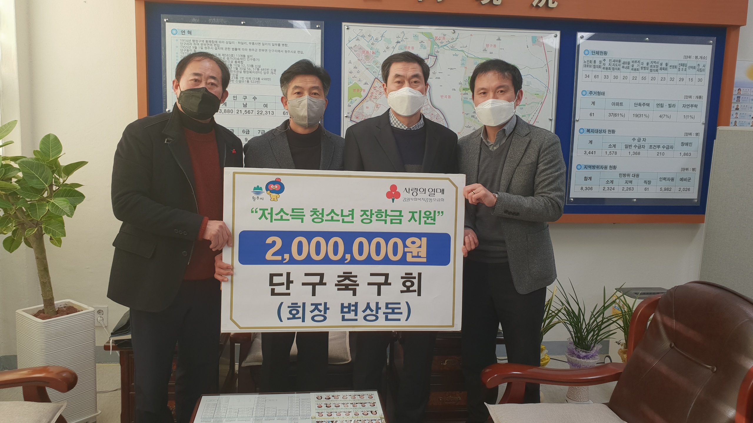 [강원사회복지신문 홍기한 기자]=원주시 단구축구회(회장 변상돈)는 지난 2월 23일 단구동 행정복지센터를 방문해 저소득층 청소년 장학금으로 200만 원을 전달했다. 변상돈 회장은 "가정형편이 어려운 학생들이 학업에 정진해 당당한 사회의 일원으로 성장하기를 바라는 마음에 장학금을 후원하게 됐다."라고 말했다. 한편 ...