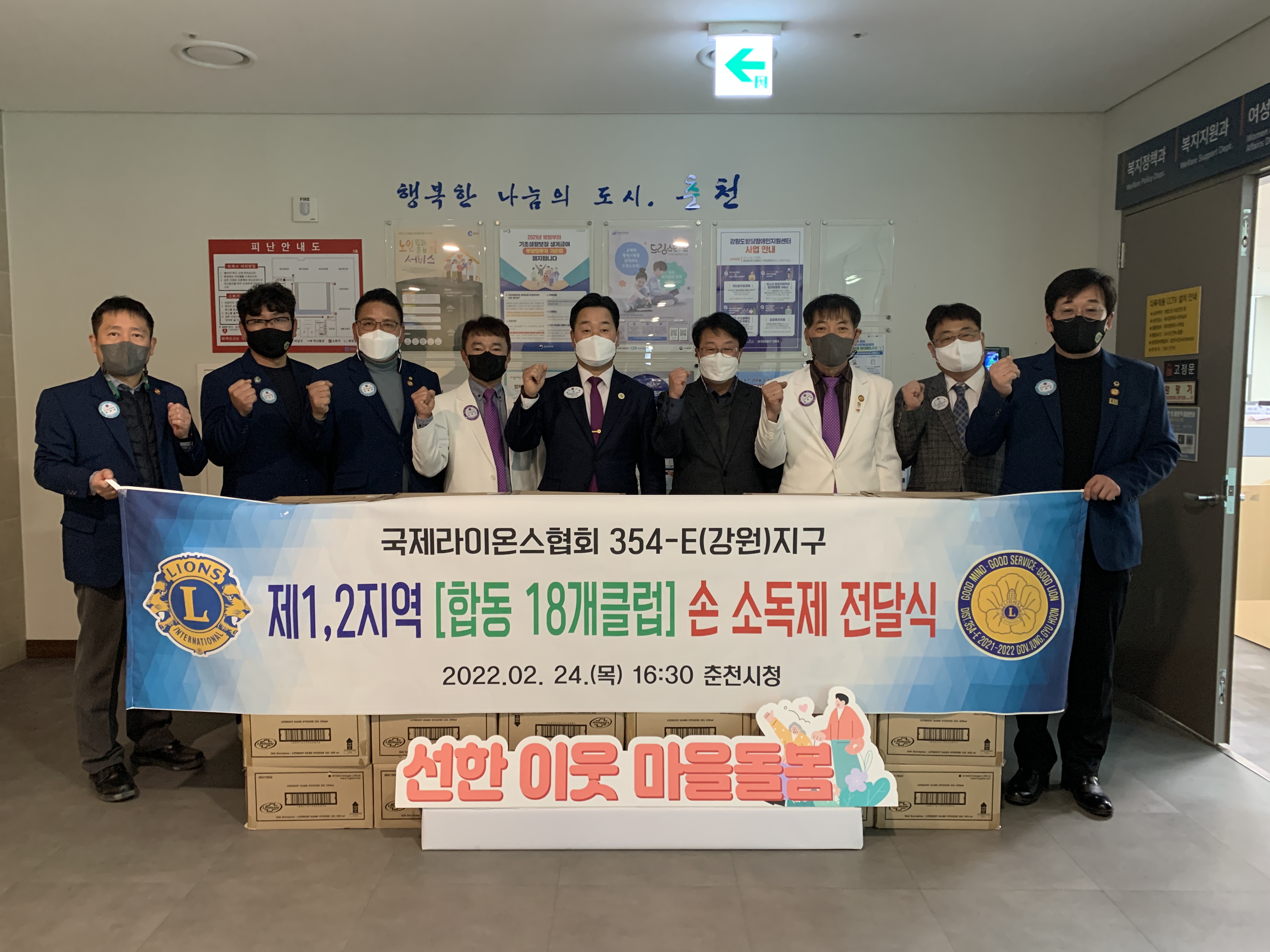 [강원사회복지신문 홍기한 기자]=국제라이온스협회 354-E (강원) 지구 제1, 2지역은 최근 지역 내 지역아동센터를 위해 손소독제 600개를 춘천시정부에 전달했다.