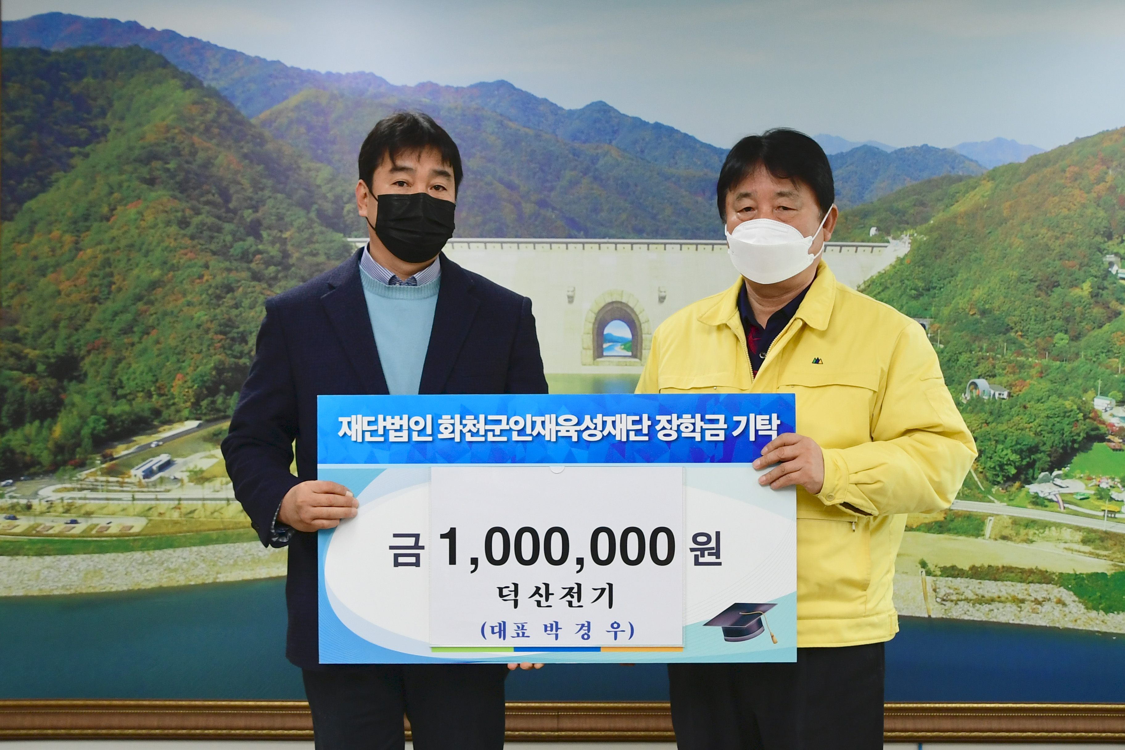 [강원사회복지신문 이정환 기자]=박경우 덕산전기 대표는 지난 2월 8일 최문순 화천군 인재육성재단 이사장을 방문해 장학금 100만원을 기탁했다.