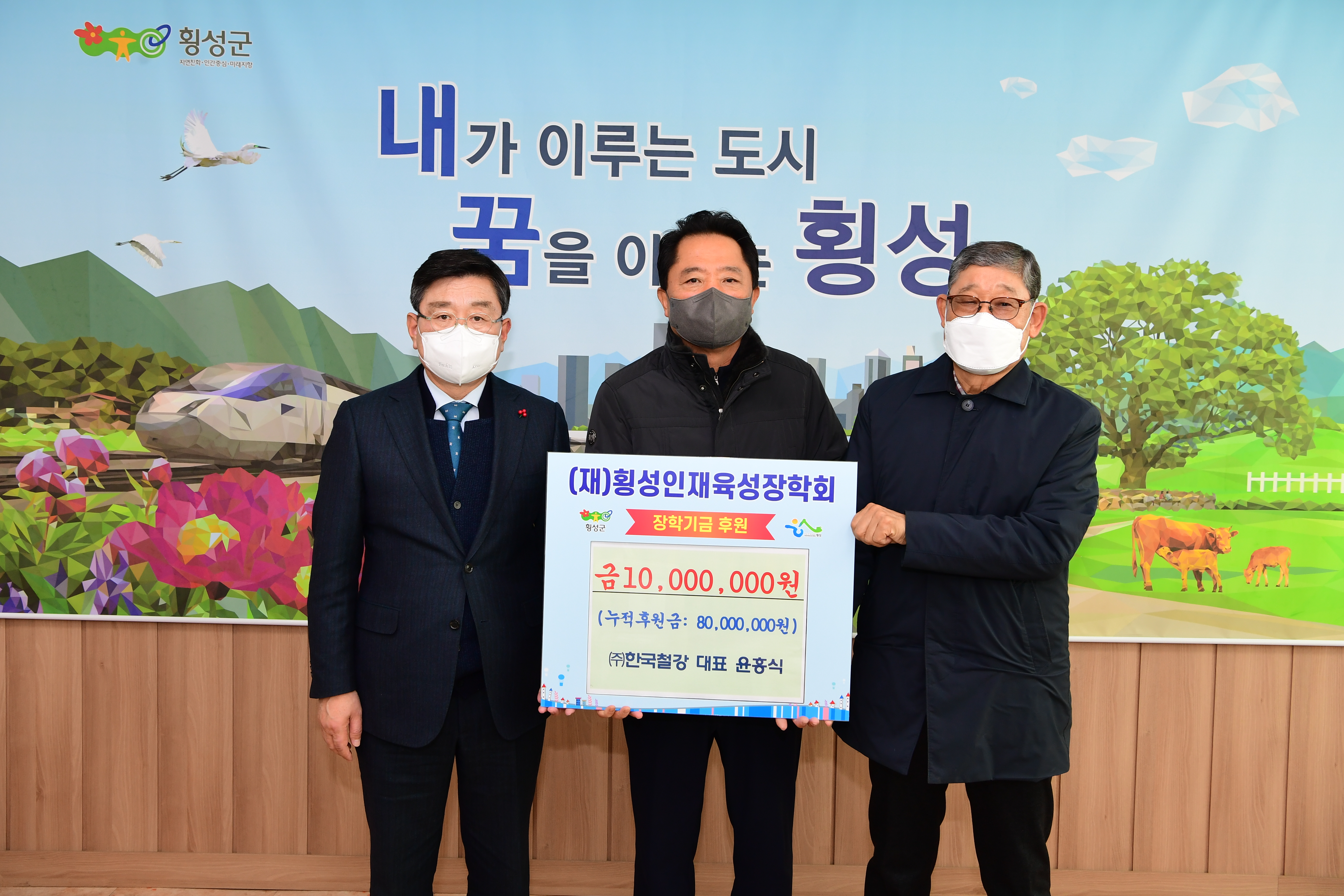 [강원사회복지신문 홍기한 기자]=한국철강(대표 윤홍식)은 지난 12월 27일 오전 11시 30분, 군수 집무실을 방문하여 횡성인재육성장학금 1천만원을 기탁하였다. 한국철강은 우천면에 위치하고 있으며, 이날 기탁으로 누적금액 7천만원을 달성하였다. 기탁식에는 윤홍식 대표와 최현식 횡성인재육성장학재단 이사가 참석하였다...