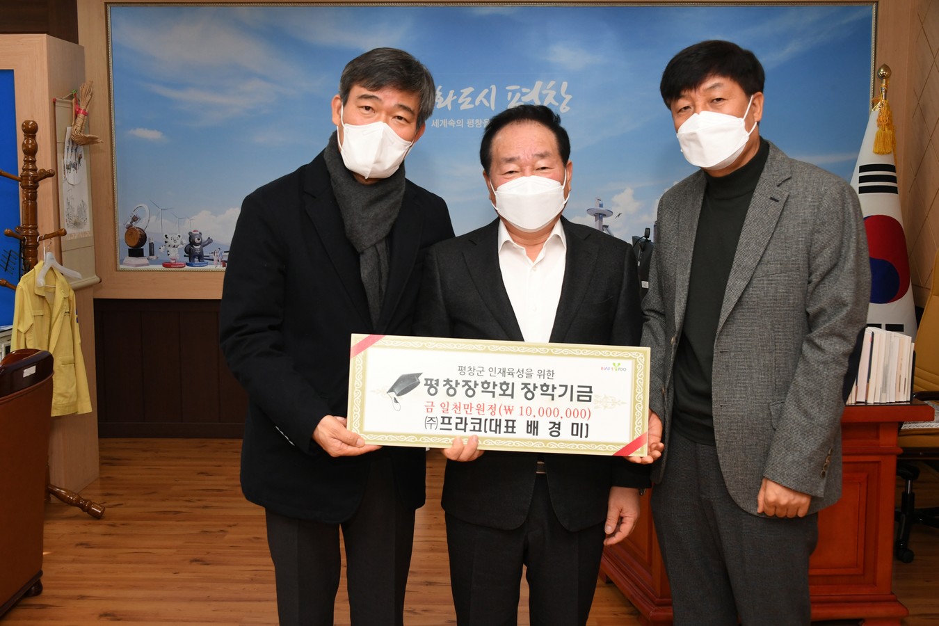 [강원사회복지신문 최재석 기자]=평창장학회는 지난 12월 27일 평창군수 집무실에서 평창산양삼특구영농조합법인(대표 김계남)에서 300만원, 이길신평창산삼(대표 이길신)에서 300만원, (주)프라코(대표 배경미)에서 지역인재 육성에 힘써달라며 1,000만원을 평창장학회에 기탁하였다고 밝혔다. 또한 이날 기탁식에 참석하지...