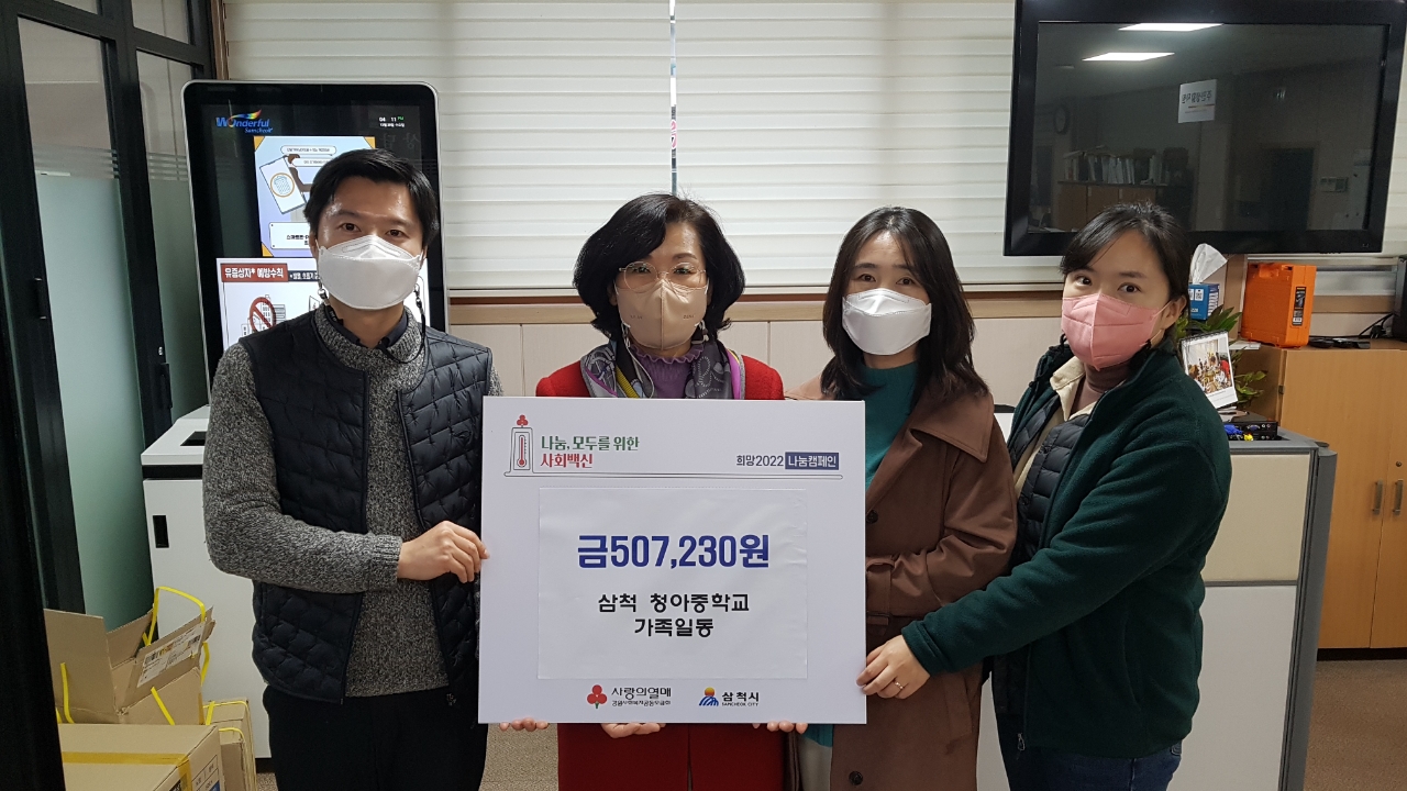 [강원사회복지신문 김종한 기자]=삼척 청아중학교(교장 주향숙)에서는 연말연시를 맞아 지난 12월 29일 삼척시 성내동행정복지센터를 방문해 이웃돕기 성금으로 50만원을 기탁했다. 이번 성금은 청아중학교 3학년 졸업반 학생들이 손수 만든 손뜨개 수세미를 교직원 및 전교생들에게 판매해 얻은 수익금으로, 강원도사회복지...