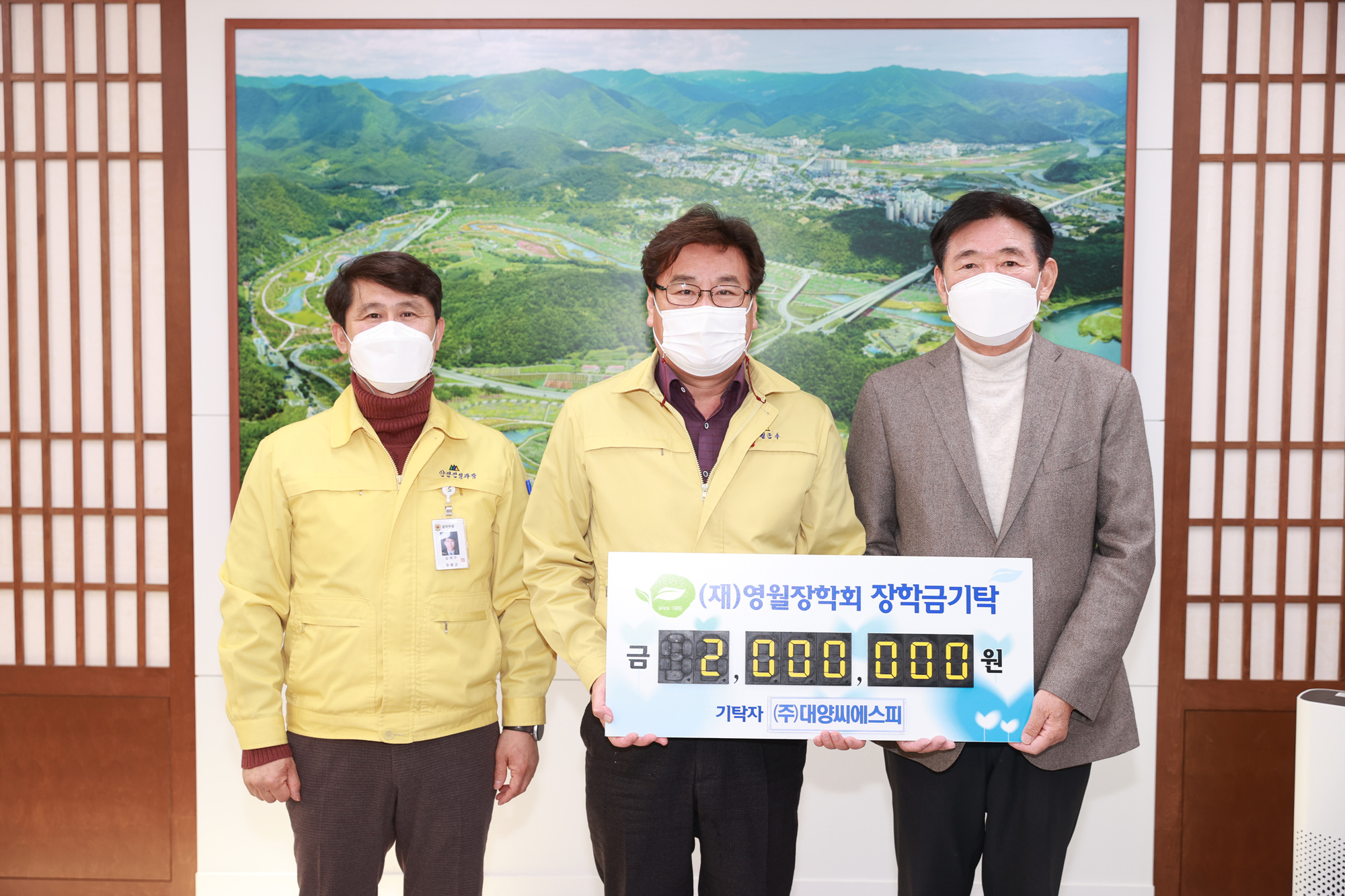 [강원사회복지신문 홍기한 기자]=(주)대양씨에스피(대표 신현복)는 지난 12월 27일 영월지역 인재육성을 위해 장학금으로 쓰이길 바란다며 2백만원을 재단법인 영월장학회(이사장 최명서)에 기탁하였다.