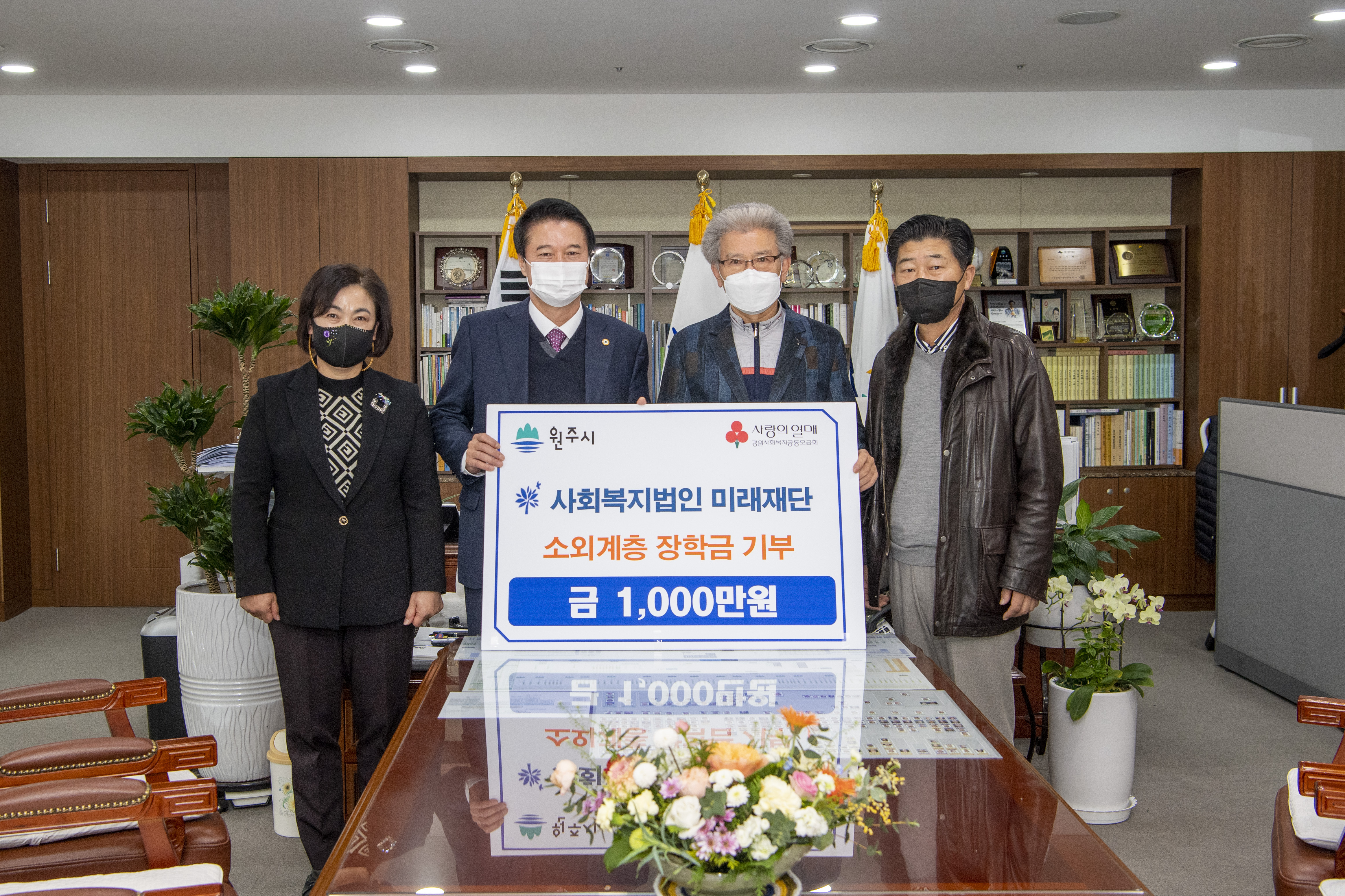 [강원사회복지신문 서은진 기자]=사회복지법인 미래재단(회장 정길용)은 지난 12월 14일 원주시장 집무실을 방문해 소외계층을 위한 장학금 1,000만 원을 전달했다. 정길용 회장은 "코로나19로 어려움을 겪고 있는 소외계층의 학습증진을 지원하고자 후원하게 됐다."라고 말했다. 사회복지법인 미래재단은 저소득 아동 생계 ...