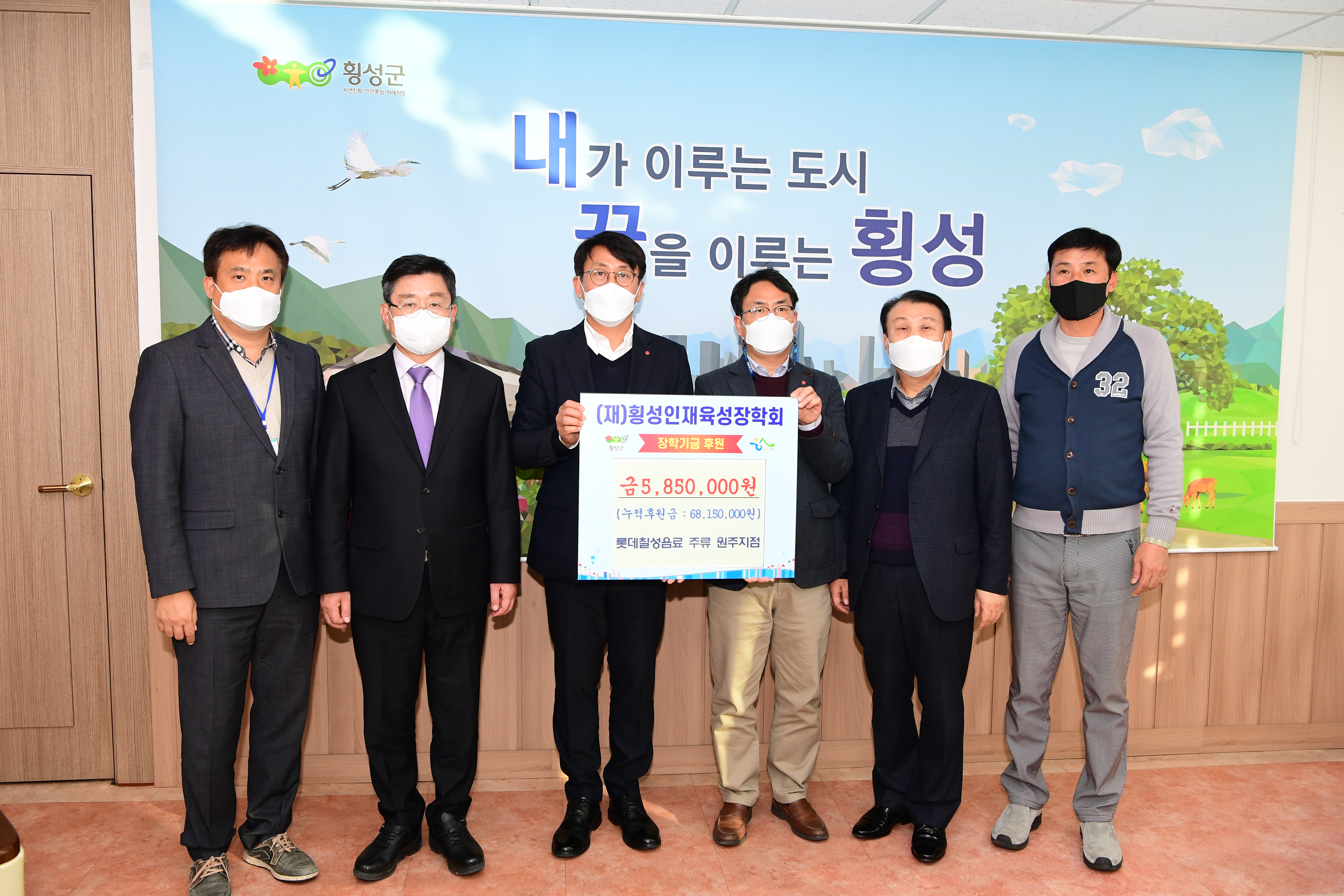 [강원사회복지신문 홍기한 기자]=롯데칠성음료주류가 지난 11월 29일, 횡성군(군수 장신상)에 횡성인재육성장학금 585만원을 기탁했다. 롯데칠성음료주류 김윤종 상무는 이날 오후 3시 30분 군수 집무실을 방문, 지역 인재들을 위해 써달라며 장학금 585만원을 전달했다. 기탁식에는 장신상 군수와 롯데칠성음료주류 김윤종 ...