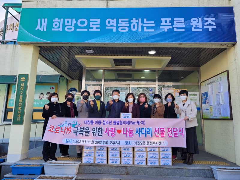 [강원사회복지신문 유경수 기자]=지역아동센터와 초·중 교육복지사 등으로 구성된 원주시 태장동 아동·청소년 돌봄협의체(대표 민종욱)는 지난 11월 29일 지역 취약계층을 위한 '사랑 나눔 사다리 선물꾸러미' 25개를 태장2동 행정복지센터(동장 정은일)에 전달했다.