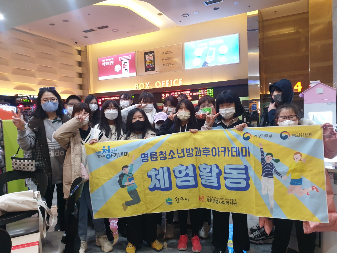 [강원사회복지신문 서은진 기자]=원주 명륜종합사회복지관 청소년방과후아카데미에서는 지난 11월 13일 주말체험활동으로 영화관람(이터널스)을 실시했다. 청소년들의 수요에 맞춰 진행된 이번 체험은 스트레스 해소와 힐링을 위한 시간이 되었으며, 세상을 보다 넓게 바라보는 안목을 키울 수 있는 즐거운 시간이 되었다.