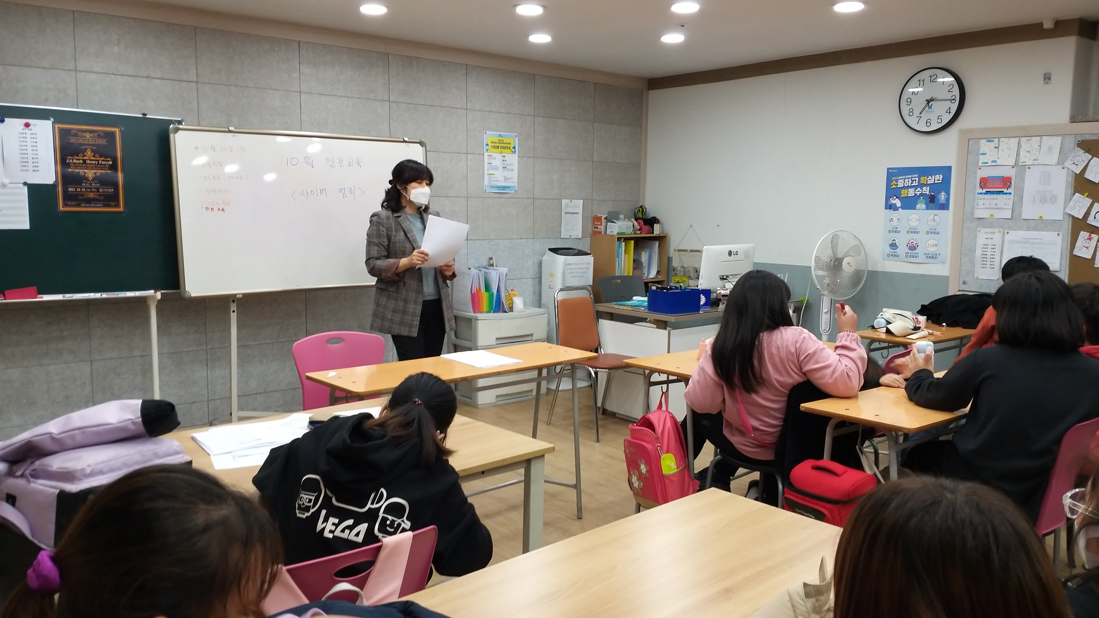 [강원사회복지신문 서은진 기자]=명륜종합사회복지관 청소년방과후아카데미에서는 지난 10월 20일 수요일 ‘사이버 폭력예방’ 에 대한 안전 교육을 진행하였다. 사이버 폭력의 위험성과 사이버 폭력의 다양한 사례를 배우고, 사이버폭력 내용에 대한 퀴즈문제 풀이를 통해 대처법에 대해서 배우는 유익한 시간이었다.