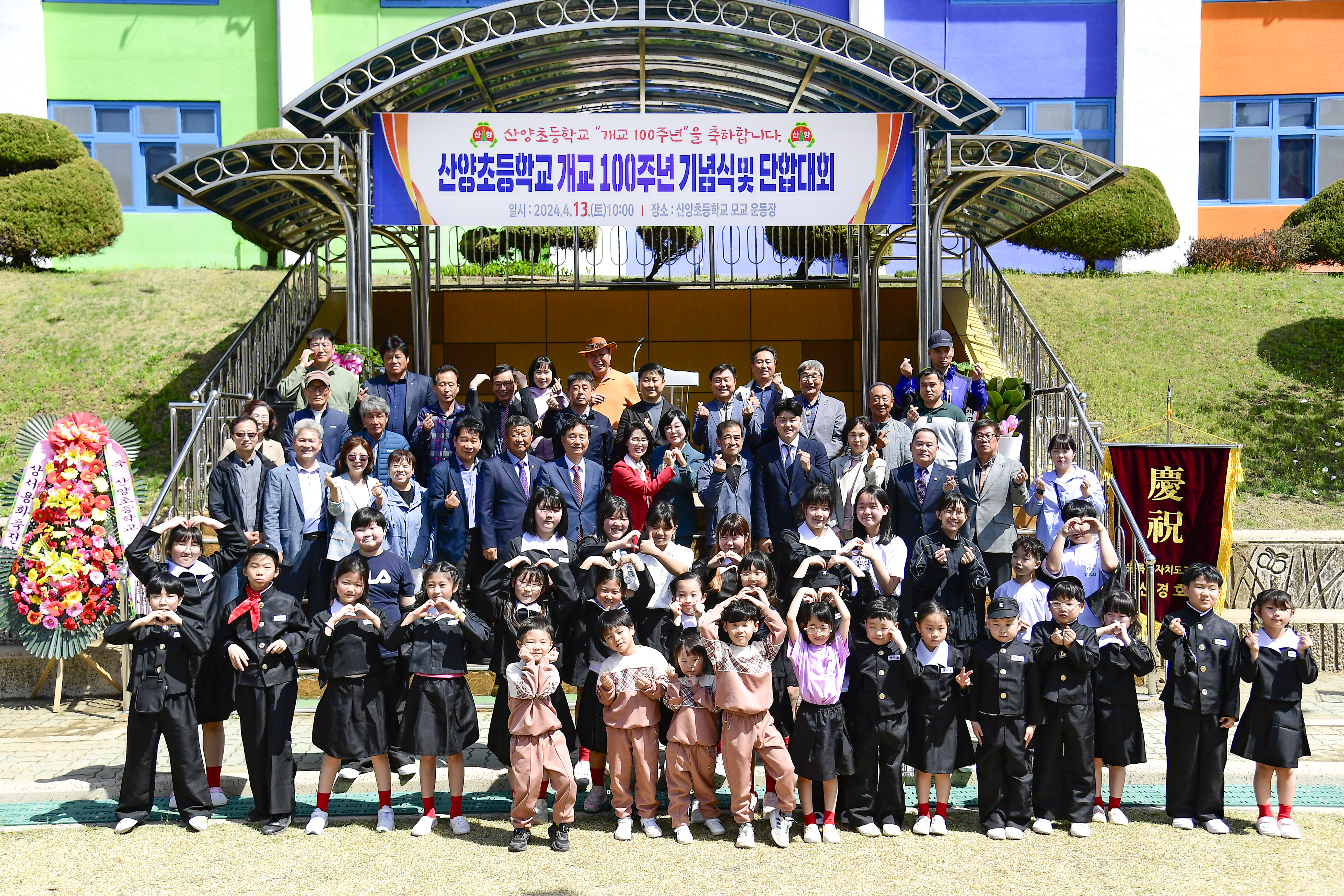 화천 산양초등학교 개교 100주년 기념행사가 지난 4월 13일 산양초교에서 최문순 군수, 김종녀 교육장, 김동선 교장, 박대현 도의원, 노이업 군의장과 군의원들을 비롯해 학생과 학부모, 동문가족 등이 참석한 가운데 열렸다.