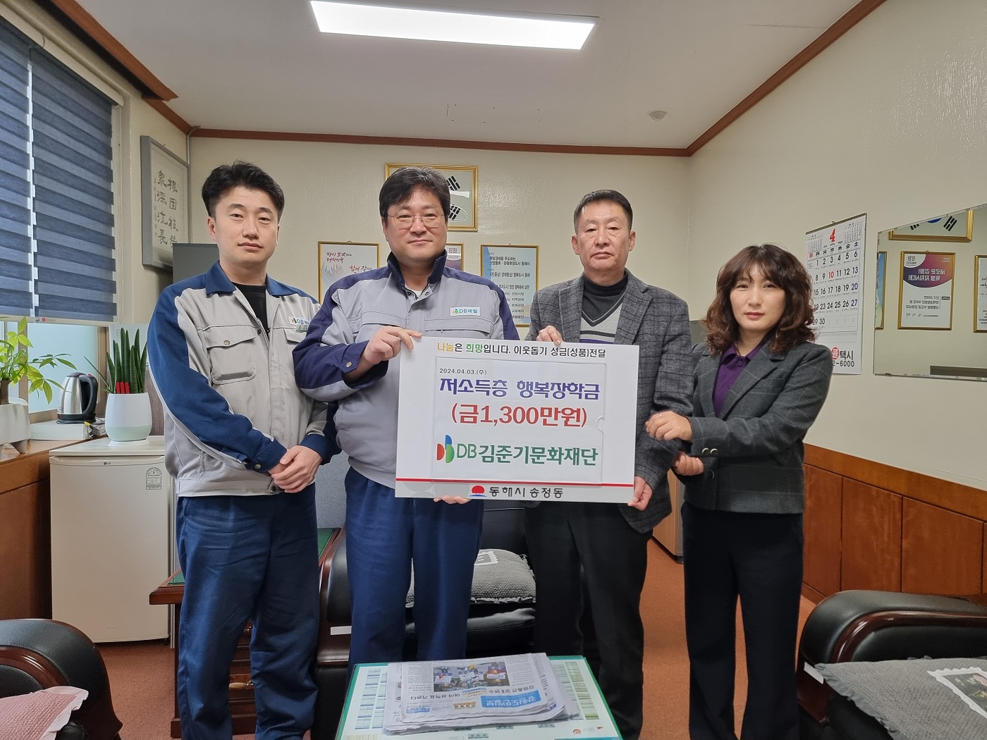 DB김준기문화재단에서 동해시 송정동 관내 저소득층 자녀들에게 행복장학금 1,300만 원을 지원하였다. 이번 행복장학금은 DB김준기문화재단에서 지역사회발전 및 지역 청소년의 복리 증진을 위한 장학복지 후원금으로, 저소득가정 자녀들의 학력 저하를 예방하고 도움을 주고자 초, 중, 고, 대학교에 재학 중인 송정동 저소득...