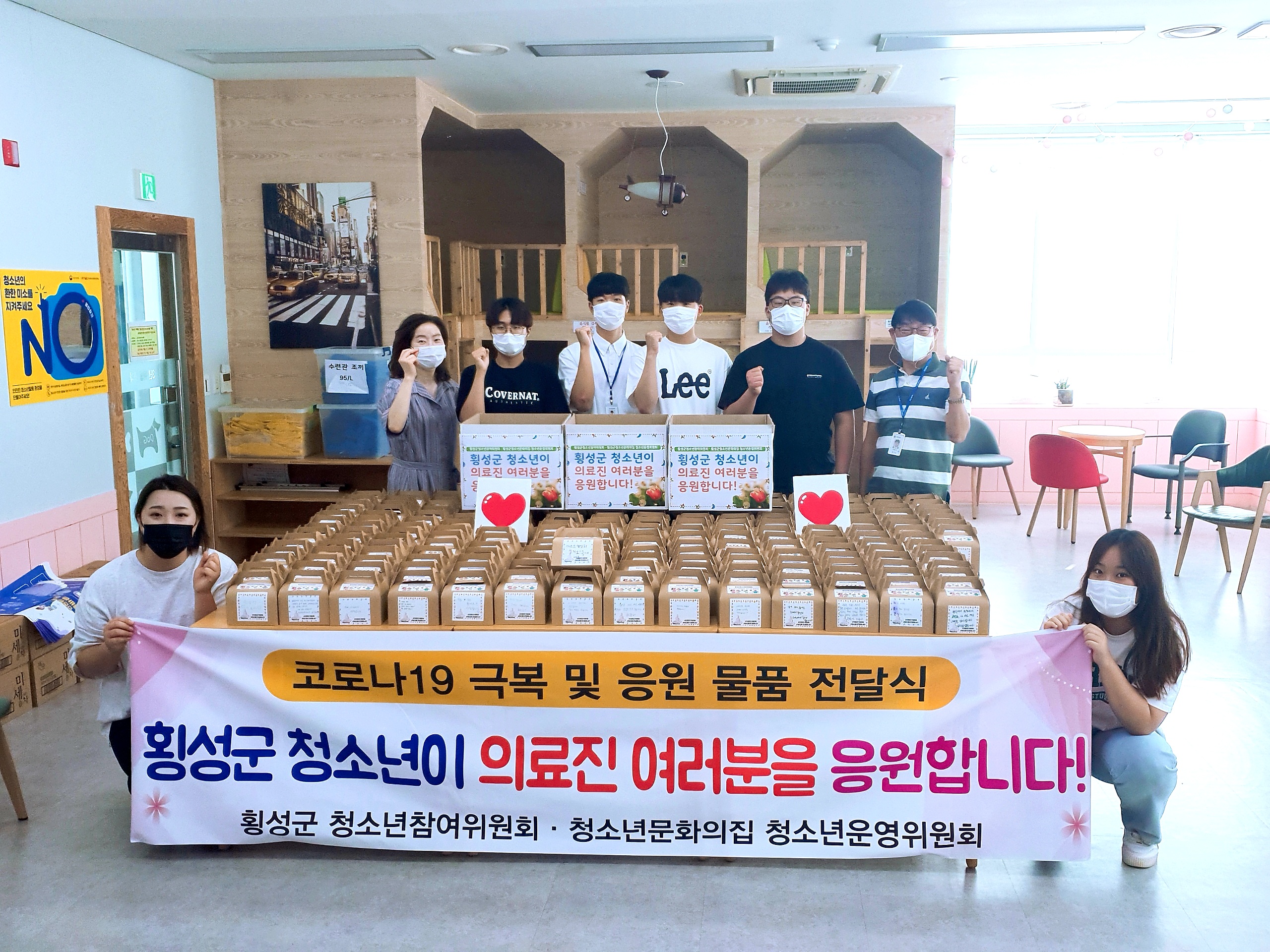 [강원사회복지신문 홍기한 기자]=코로나19 대응 인력에 직접 만든 빵과 쿠키 200세트 전달 군민들이 쓴 손편지와 함께 전달해 횡성군 청소년참여위원회(위원장 김민재)와 횡성군청소년문화의집 청소년운영위원회(위원장 강성길)가 지난 7월 28일 보건소를 찾아 의료진에게 응원 물품 200세트(직접 만든 빵과 쿠키, 사탕, 음료...