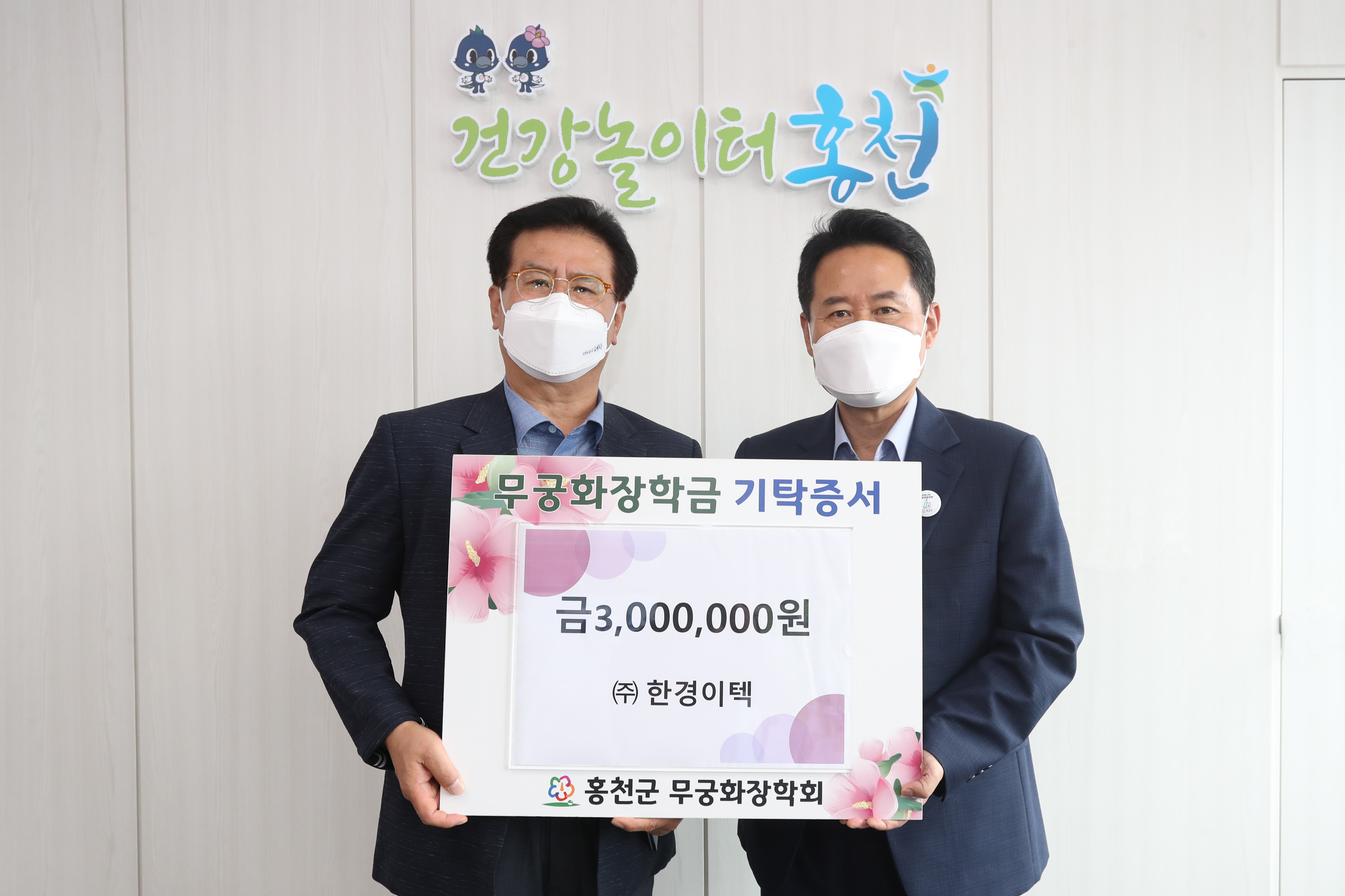 [강원사회복지신문 홍기한 기자]=(주)한경이텍 김광수 대표는 지난 7월 5일 홍천군청을 방문, 허필홍 홍천군수에게 무궁화 장학금 300만원을 전달했다.