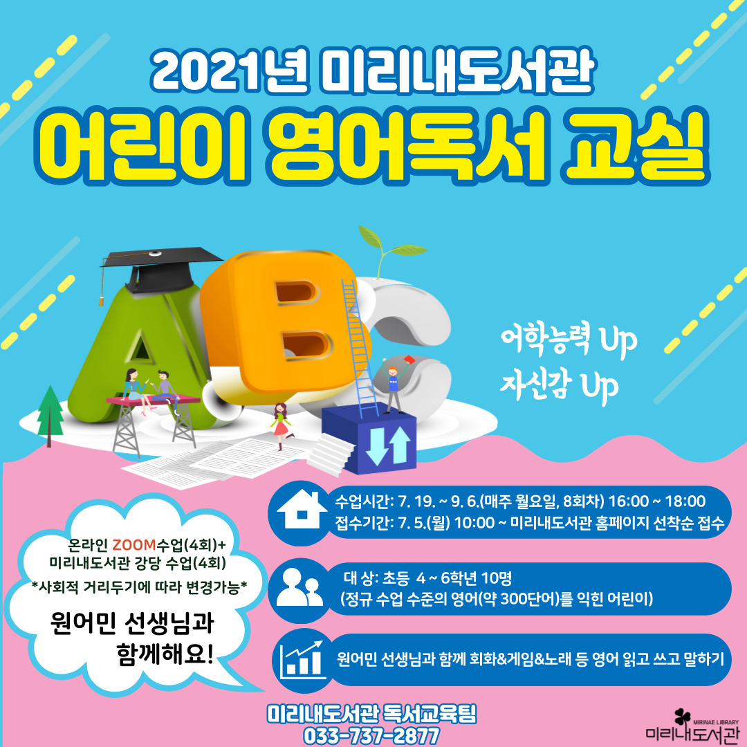 [강원사회복지신문 서은진 기자]=원어민 선생님과 영어 그림책 읽으며 다양한 체험형 교육 진행 초등 4~6학년 10명, 7월 5일 오전 10시부터 도서관 홈페이지 선착순 접수 원주 미리내도서관(관장 김영열)이 원어민 선생님과 함께하는 어린이 영어독서 교실을 운영한다. 초등학교 4~6학년 정규수업 수준의 영어를 익힌 어린이...