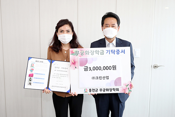 [강원사회복지신문 홍기한 기자]=(주)크린산업 이미옥 대표는 지난 6월 10일 홍천군청을 방문, 허필홍 홍천군수에게 무궁화장학금 300만원을 전달했다. 크린산업은 지난해에도 300만원의 무궁화장학금을 전달한 바 있다.