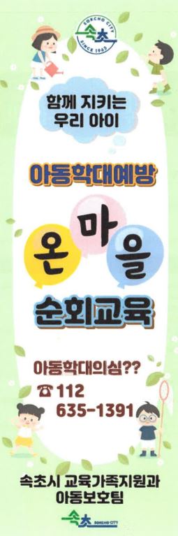 속초시는 아동학대 발견 시 이웃주민 누구나 즉각 신고하여 피해아동에 대한 신속한 보호조치가 이루어질 수 있도록 아동학대예방 온마을 순회교육을 실시한다. 이번 교육은 지난 3월 21일 교동주민센터를 시작으로, 8개 동, 총 240명의 통장을 대상으로 각 동 통장회의 시 실시되며, 아동학대의 정의 및 유형, 신고방법, 아...