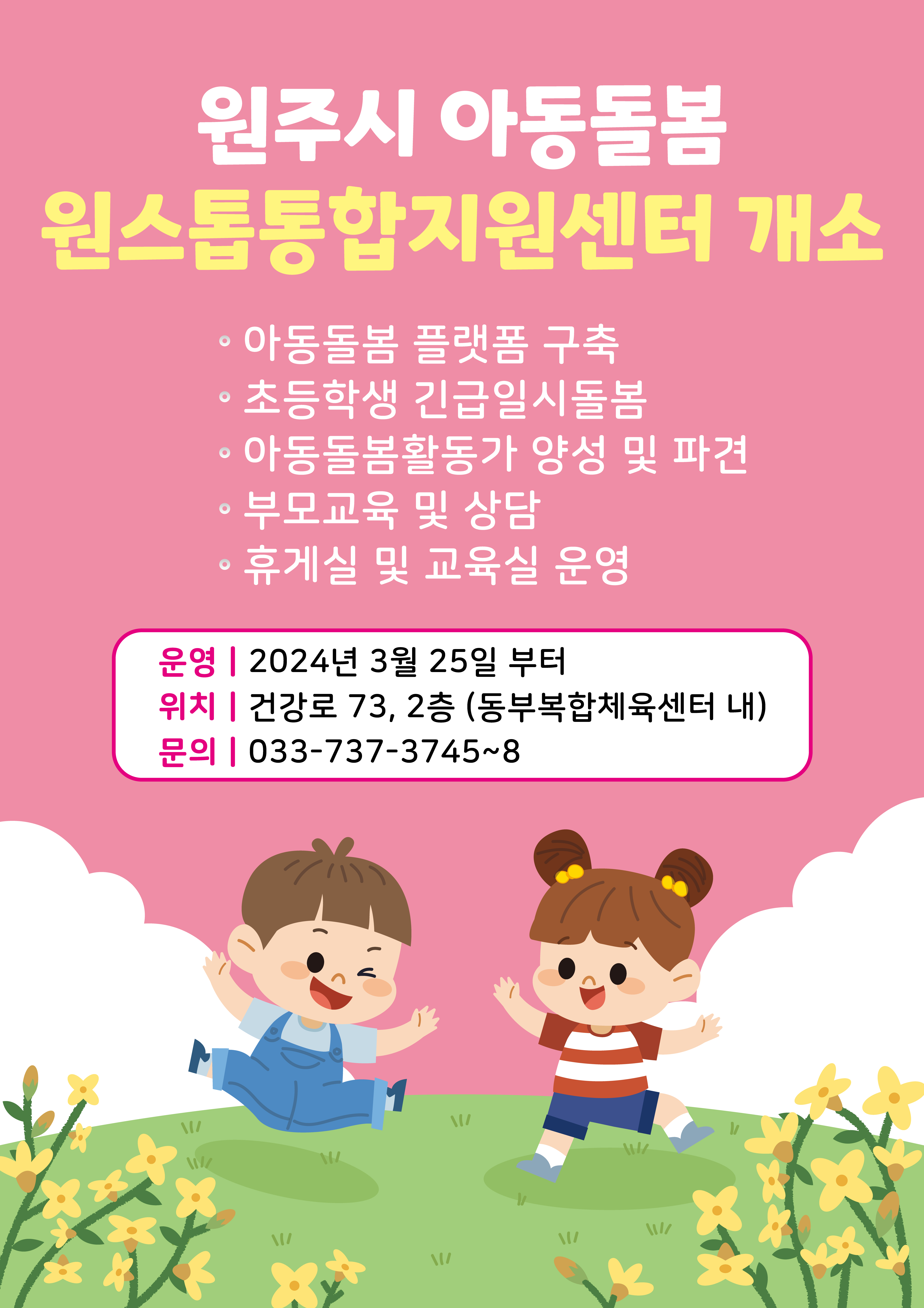 원주시 아동돌봄 원스톱통합지원센터가 3월 25일 정식 개소하고 본격적인 운영에 들어간다. 원주동부 복합체육센터 2층에 개소한 ‘원주시 아동돌봄 원스톱통합지원센터’는 아동 돌봄에 대한 정보와 신청 체계를 일원화해 편리하게 이용할 수 있는 아동돌봄서비스를 제공할 계획이다. 이를 위해, 오는 10월 도내 최초로 아동...