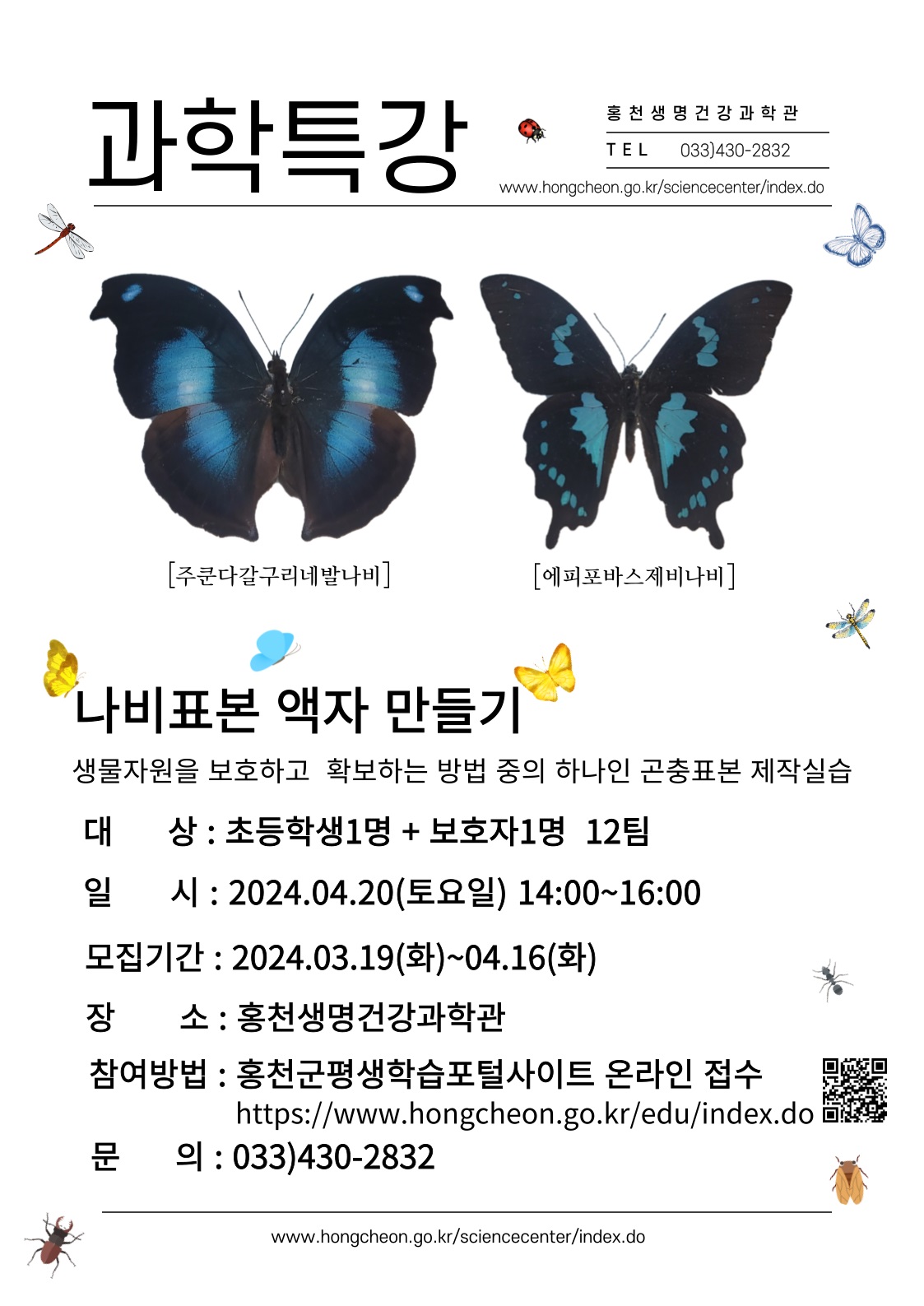 홍천군(군수 신영재)은 초등학생들에게 다양한 영역의 과학탐구활동을 체험할 수 있는 과학특강을 운영한다. 신청기간은 오는 4월 16일까지 12팀(초등학생1명+보호자1명)을 모집하며, 수강료는 무료이다. 특강참여는 홍천군평생학습포털사이트[https://www.hongcheon.go.kr/edu/index.do]에서 온라인으로 신청 가능하며, 자세...