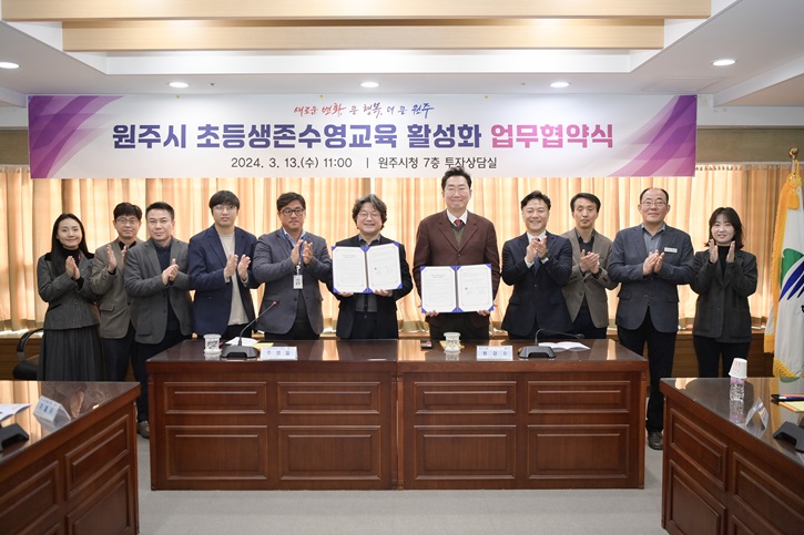 원주시와 원주교육지원청은 지난 3월 13일 오전 11시 시청 7층 투자상담실에서 ‘원주시 초등생존수영교육 활성화’ 업무협약식을 체결하고 적극 협력하기로 했다. 협약의 주요 내용은 ▲초등생존수영교육을 위한 원주시 운영 공공수영장 적극 개방 ▲공공수영장 시설 개방 안내 및 희망학교 조사·공유 ▲초등생존수영교육 ...