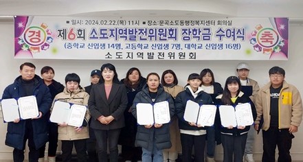 태백시 문곡소도동 소도지역발전위원회(위원장 황상덕)는 지난 2월 22일 태백시 문곡소도동 행정복지센터에서 지역학생 37명을 대상으로 제6회 장학금 전달식을 가졌다. 소도지역발전위원회 회원들과 문곡소도동 관계자, 학생, 학부모들이 참석한 장학금 전달식에서 중학교 진학 초등학생 14명에 각 30만 원씩, 고교 진학 중...