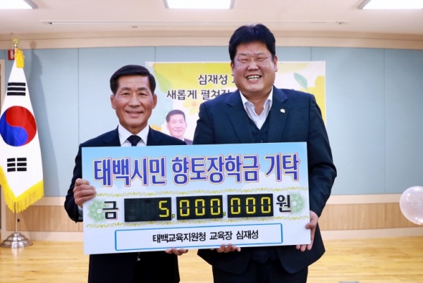 강원특별자치도 태백교육지원청 심재성 교육장은 지난 2월 22일 태백시에 향토장학금 500만 원을 기탁하였다. 심재성 교육장은 1984년 태백 삼성초등학교에서 첫 교직생활을 시작해 2022년 9월 강원특별자치도 태백교육지원청 교육장으로 부임하여 올해로 40년간 근무해 왔으며, 이번에 정년퇴임을 앞두고 태백시에 향토장학...