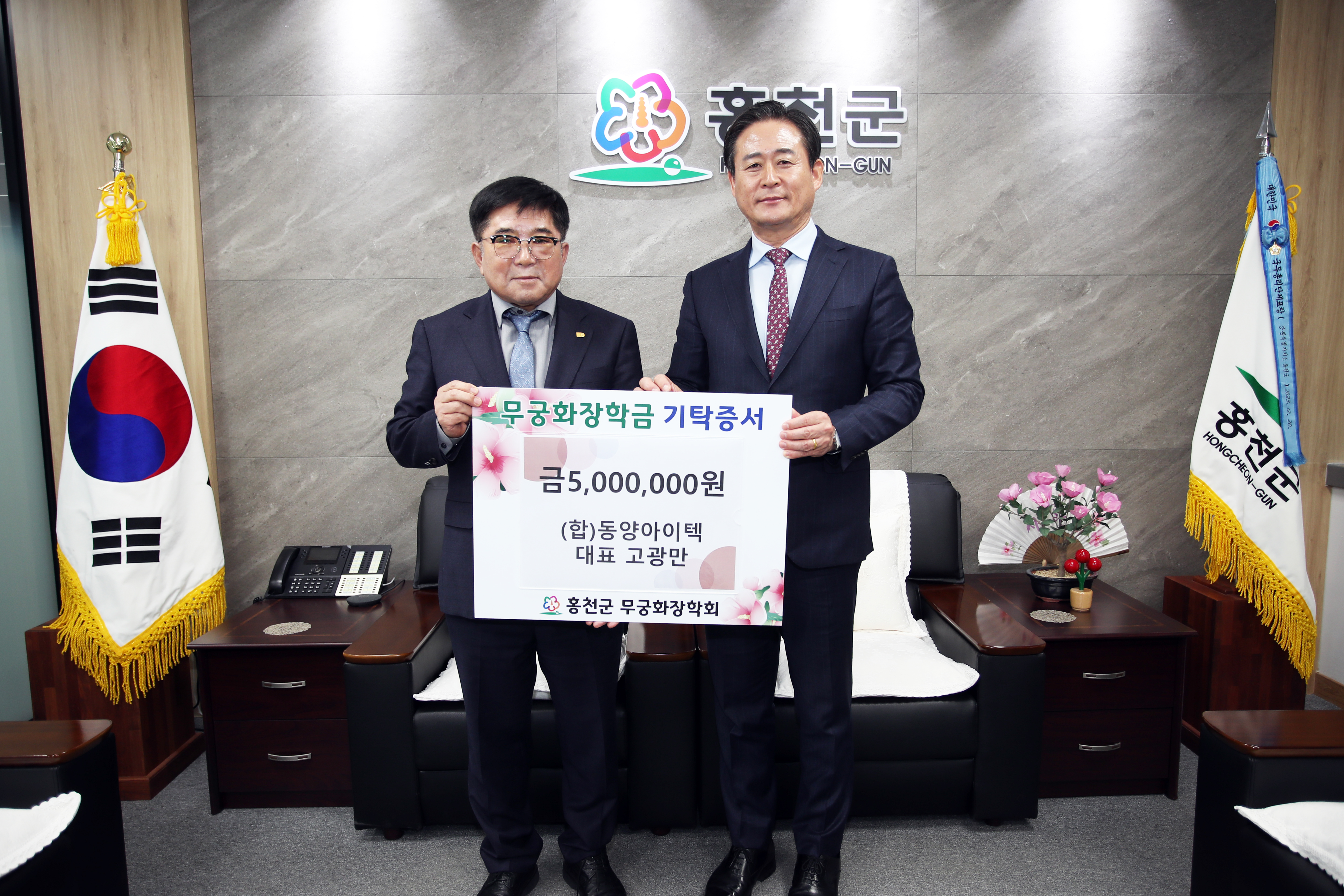 (자)동양아이텍(회장 고광만)은 지난 2월 15일 오전 10시 30분 홍천군청을 방문하여 홍천군 인재육성을 위한 무궁화장학금을 500만원을 기탁했다.