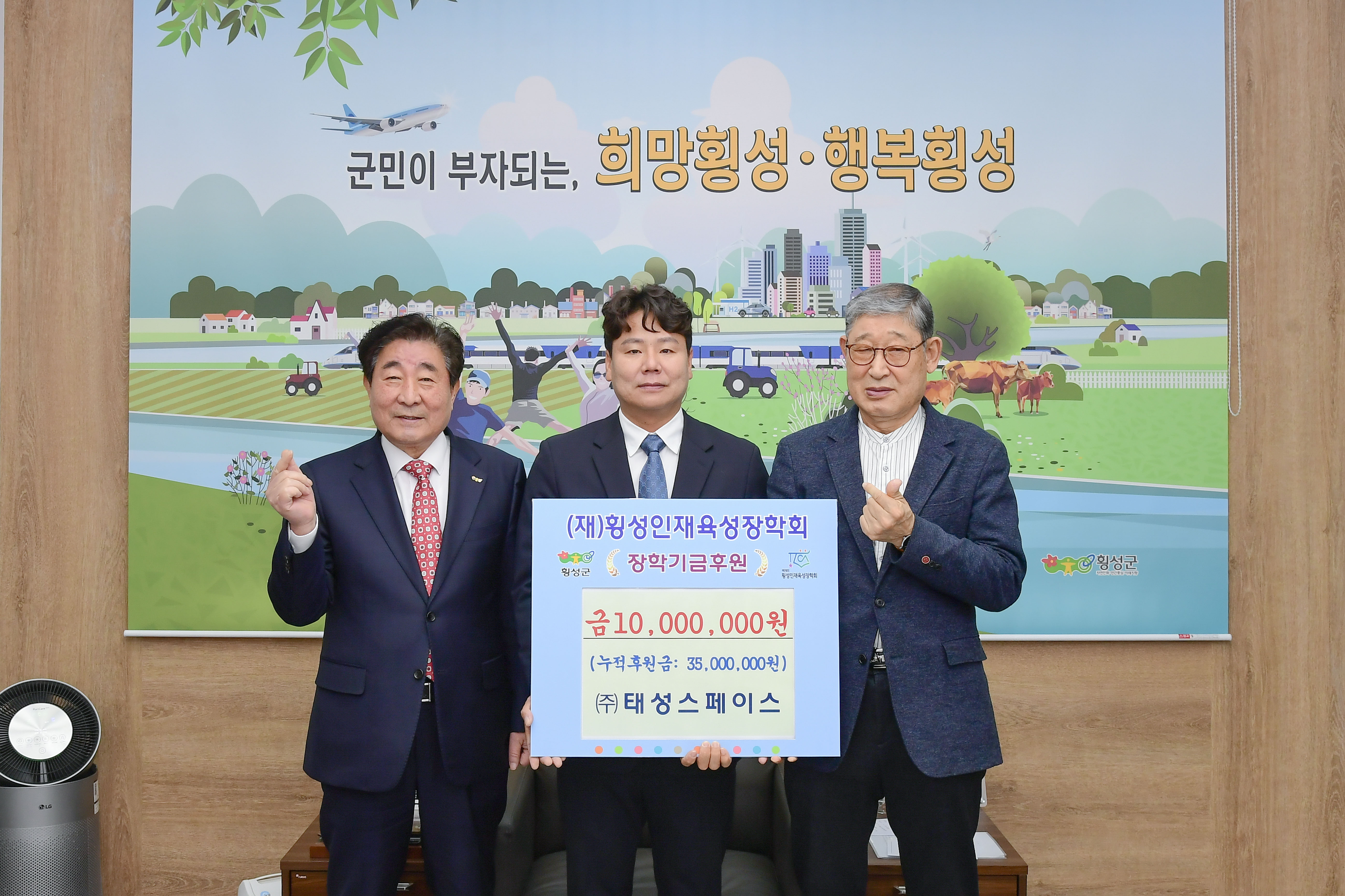 (주)태성스페이스(대표 심현성)가 지난 2월 15일 1,000만 원의 후원금을 학생들을 위해 써달라며 횡성인재육성장학회에 전달했다.