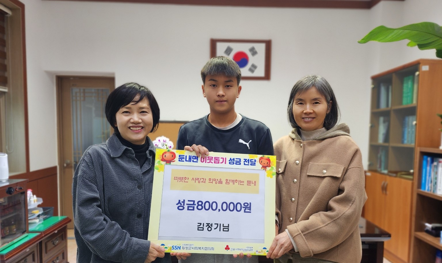 둔내중학교 김정기 학생은 지난 2월 15일 횡성군 둔내면 행정복지센터를 방문하여 이웃돕기 성금 80만 원을 전달했다.