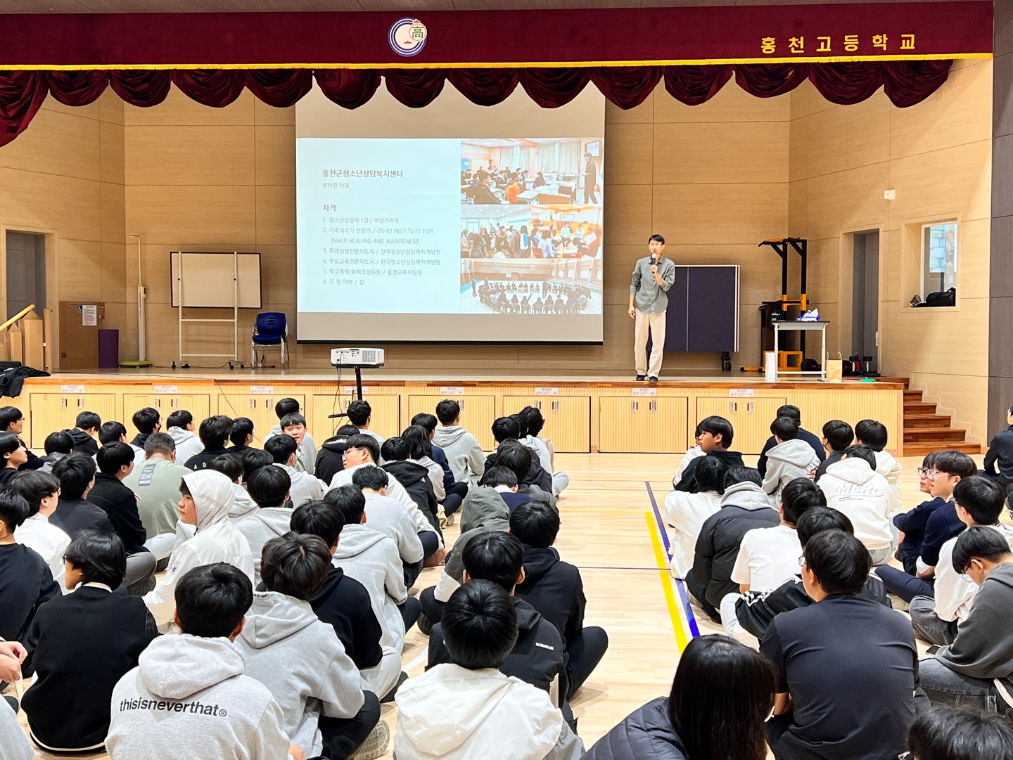 [강원사회복지신문 최재석 기자]=홍천군청소년상담복지센터(센터장:허일)는 지난 10월 13일(금) 오후 1~3시까지 홍천고등학교 463명(전교생)을 대상으로 홍천고등학교 체육관에서 생명존중교육을 진행했다. 이번 프로그램을 통해 청소년들의 심리적 회복 탄력성을 기를 수 있는 방법과 청소년 자살·자해 예방을 위한 심리 교...