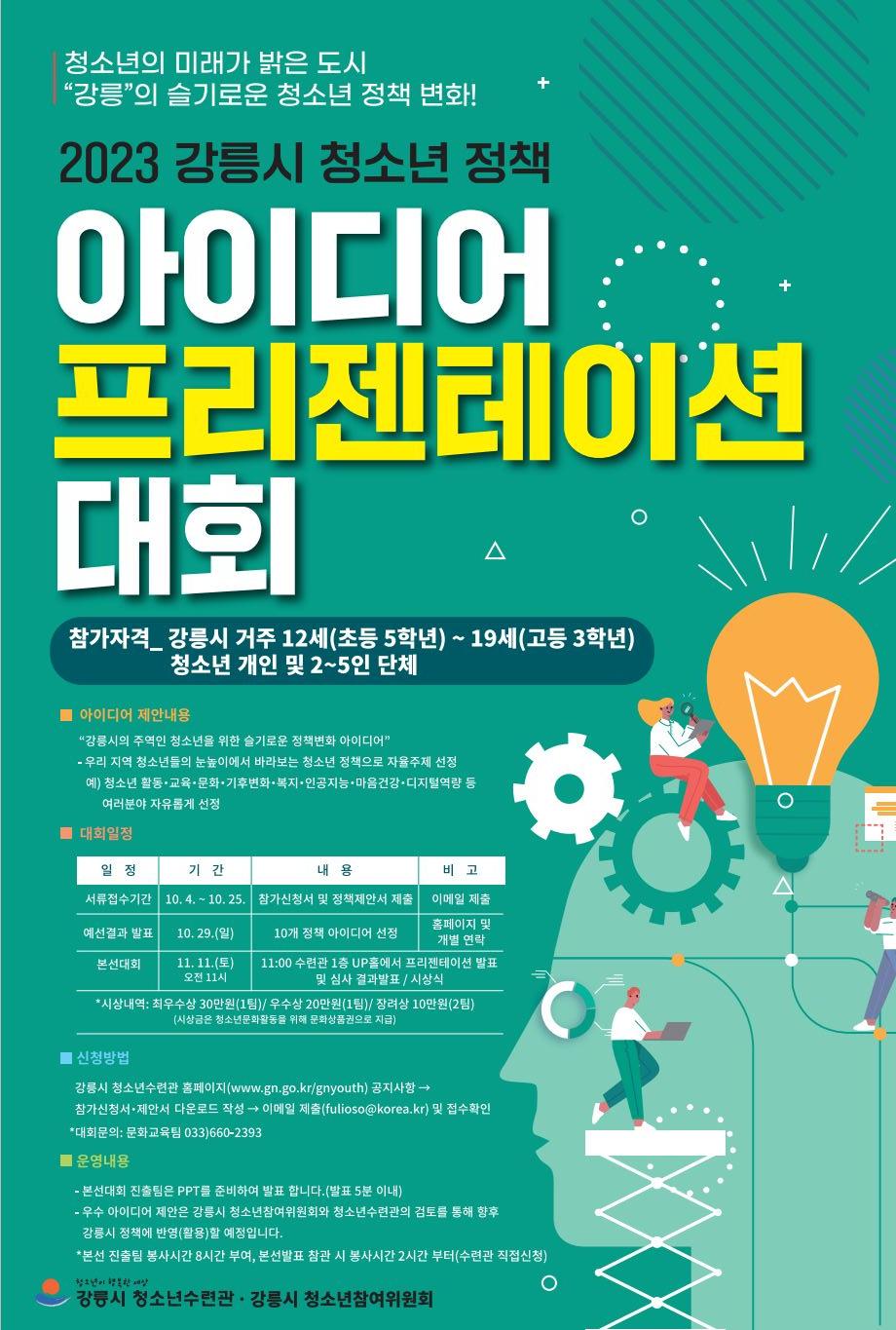 [강원사회복지신문 서은진 기자]=오는 10월 25일(수)까지, 청소년 정책 아이디어 프레젠테이션 대회 참가자 모집 강릉시 청소년수련관과 청소년참여위원회는 '강릉의 슬기로운 청소년 정책변화!'를 슬로건으로 진행하는 '2023 강릉시 청소년 정책 아이디어 프레젠테이션 대회' 참가 청소년을 오는 10월 25일(수)까지 모집한다...