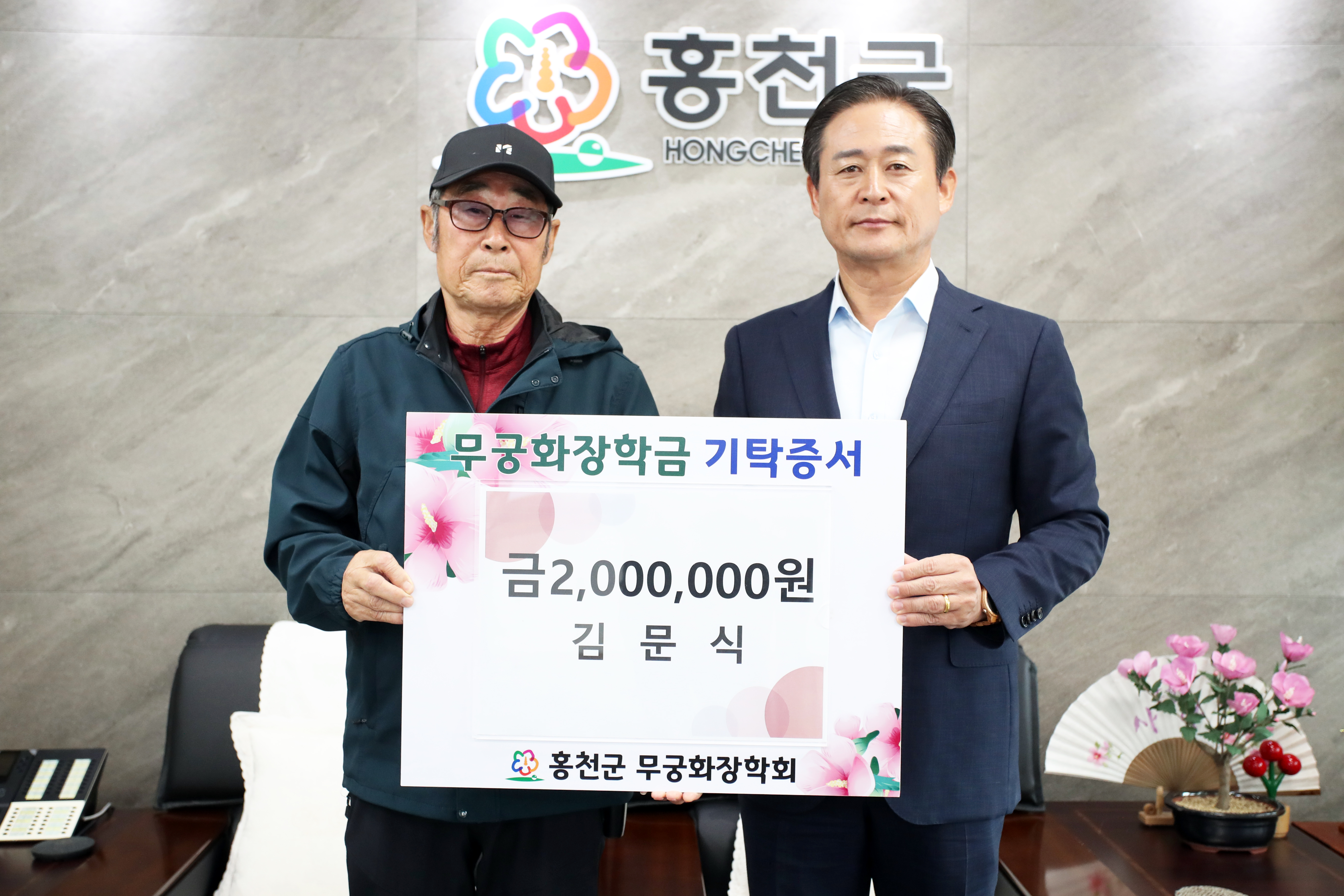 [강원사회복지신문 홍기한 기자]=개인기탁자 김문식, 신응일 씨는 2023년 전국 무궁화 우수분화 품평회에서 받은 시상금을 지난 10월 6일 오전 8시 홍천군청을 방문하여 홍천군 인재육성을 위해 써달라며 무궁화장학금 230만원을 기탁했다. 지난 2023년 전국 무궁화 우수분화 품평회에서 김문식 씨는 농림축산부장관상, 신응...