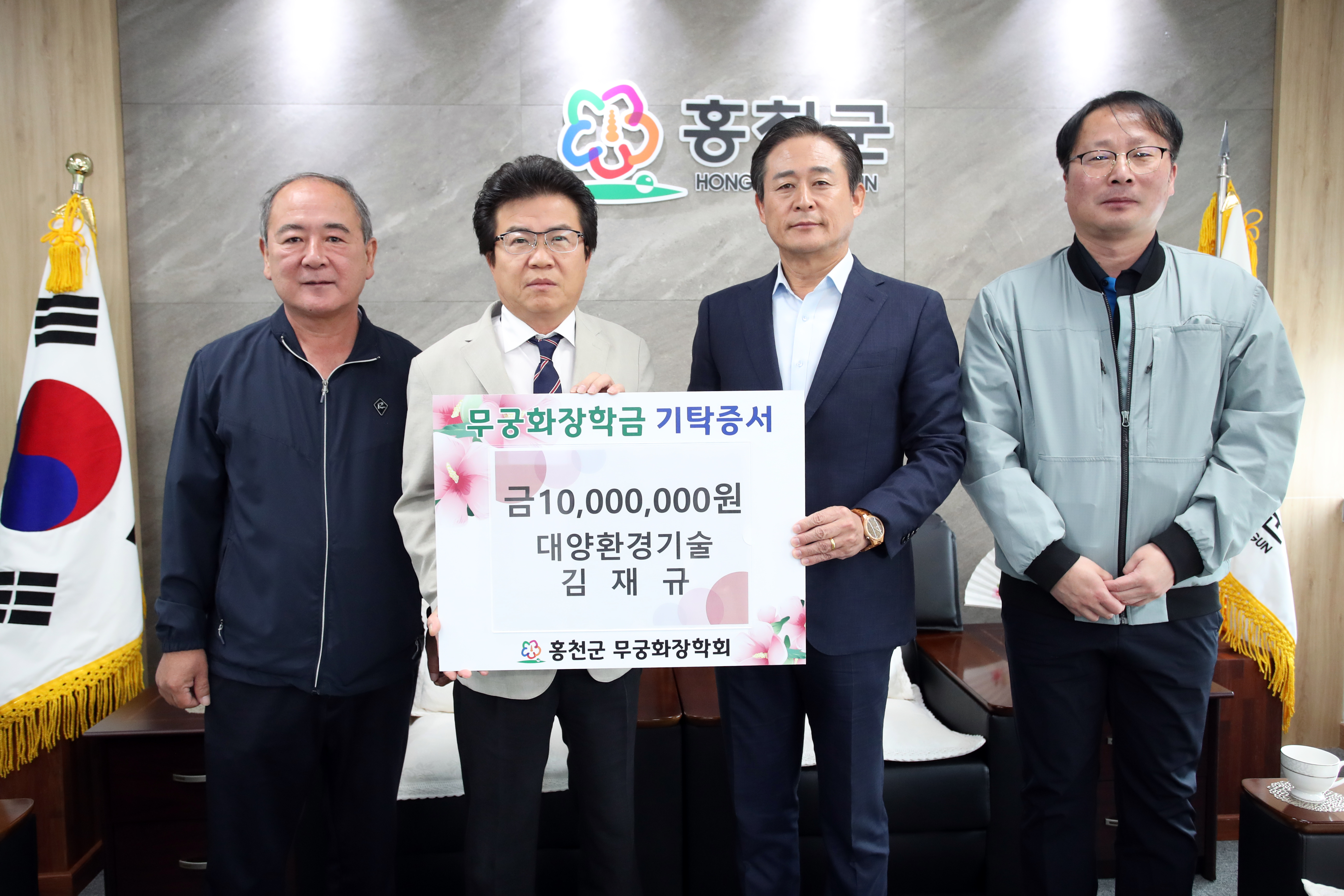 [강원사회복지신문 최재석 기자]=대양환경기술 김재규 대표는 지난 10월 6일 오전 8시 홍천군청을 방문하여 홍천군 인재육성을 위한 무궁화장학금 1,000만원을 기탁했다.