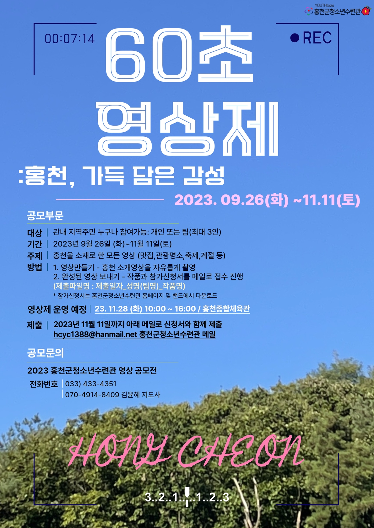 [강원사회복지신문 서은진 기자]=홍천군청소년수련관(관장 박형준)은 2023년 꿈열음 60초 영상제 '홍천, 가득 담은 감성'의 참가자를 9월26일부터 11월11일까지 모집한다고 밝혔다. 2023년 꿈열음 프로그램의 일환으로 진행되는 이번 '60초 영상제'는 홍천 관내 지역주민 누구나 개인 또는 팀 등의 제한없이 참가할 수 있으며...