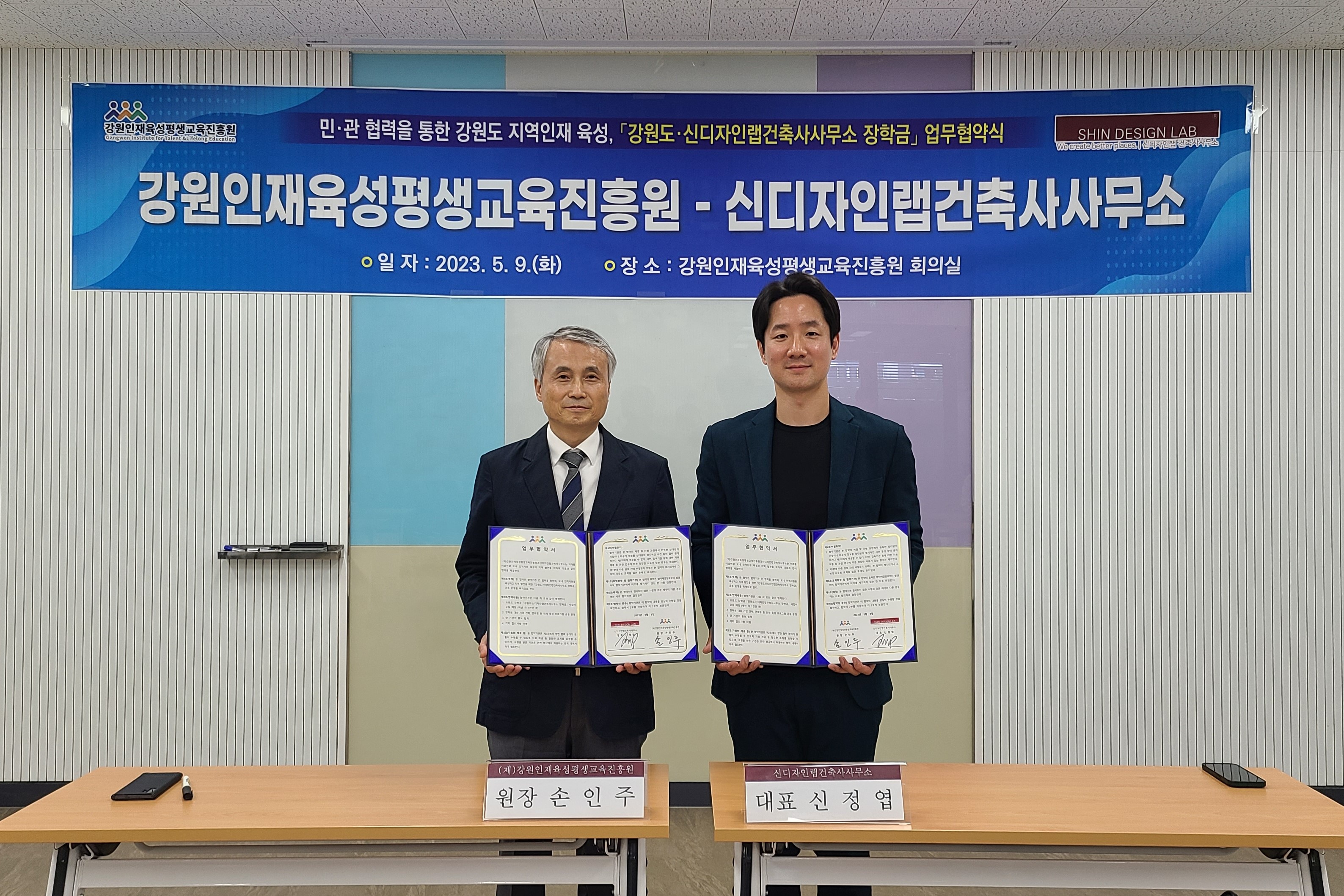 [강원사회복지신문 이정환 기자]=매년 2천만 원씩, 지역인재 육성 협력 강원인재육성평생교육진흥원(원장 손인주)은 지난 5월 9일 14시, 강원인재육성평생교육진흥원(이하 인평원) 회의실에서 신디자인랩건축사사무소(대표 신정엽)와 함께 미래를 이끌어갈 도내 인적자원 육성과 지역 발전을 위한 '강원도·신디자인랩건축사...
