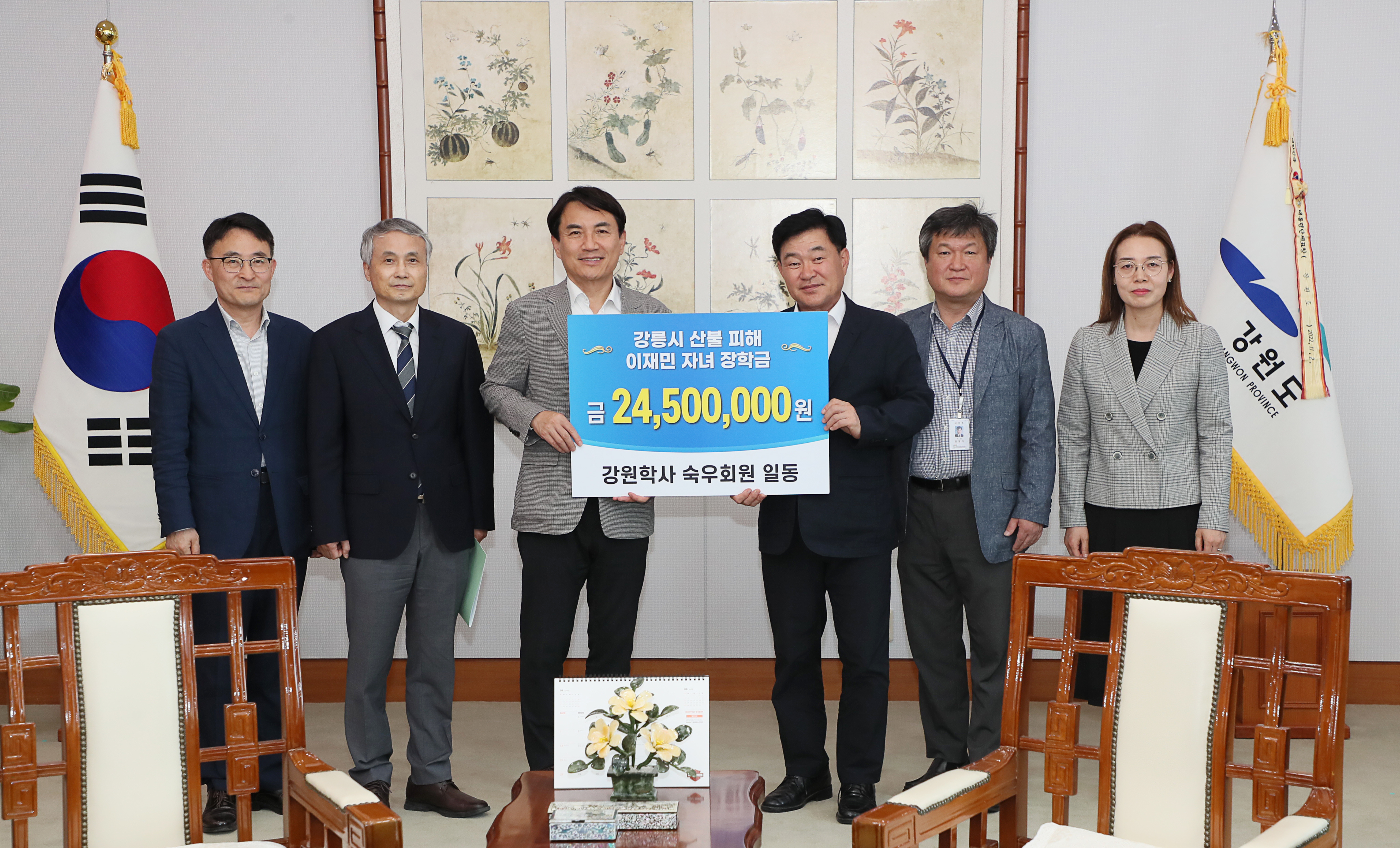 [강원사회복지신문 홍기한 기자]=강원학사 졸업생들의 모임인 숙우회(회장: 이원섭) 회원들이 강릉시 산불 피해 이재민 자녀를 위한 장학금 2,450만원을 강원도에 기탁 했다. 이번 후원금은 산불 피해로 어려움을 겪는 이재민 가구 자녀에게 장학금으로 전달될 예정이다.