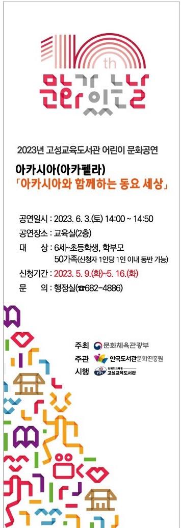 [강원사회복지신문 김도연 기자]=고성교육도서관(관장 이순형)은 지난 4월 (재)한국도서관문화진흥원이 주관하는 '2023년 문화가 있는 날' 공모사업에 선정되어, 오는 6월 3일(토) '아카시아(아카펠라) 아카시아와 함께하는 동요 세상' 공연을 진행한다. (재)한국도서관문화진흥원이 주관하는 ‘2023년 문화가 있는 날’은 농...