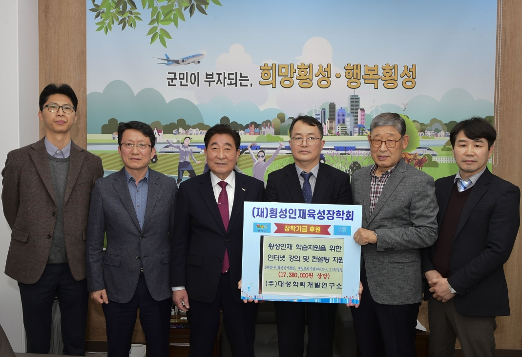 [강원사회복지신문 홍기한 기자]=(주)대성학력개발연구소는 지난 3월 22일 횡성군청 군수집무실에서 17,380,000원 상당의 물품을 기탁했다. 기탁물품은 인터넷강의(대성마이맥) 연간사용권(20명)(6,400,000원), 대성프리미엄 모의고사(20명*3회)(1,380,000원), 1:1 컨설팅프로그램(20명*3회)(9,600,000원)이다.