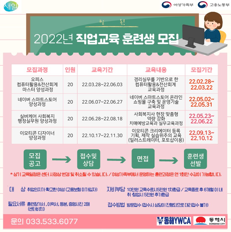 [강원사회복지신문 서은진 기자]=오피스 컴퓨터활용 & 전산회계 마스터 양성과정 지난 2월 28일(월)부터 오는 3월 22일(화) 까지 모집 동해YWCA에서 운영 중인 동해여성새로일하기센터(센터장 금후자)에서는 경력단절여성의 취업 역량을 강화하고 지역사회 및 산업체 요구에 적합한 여성 인력을 양성하기 위해 오피스 컴...
