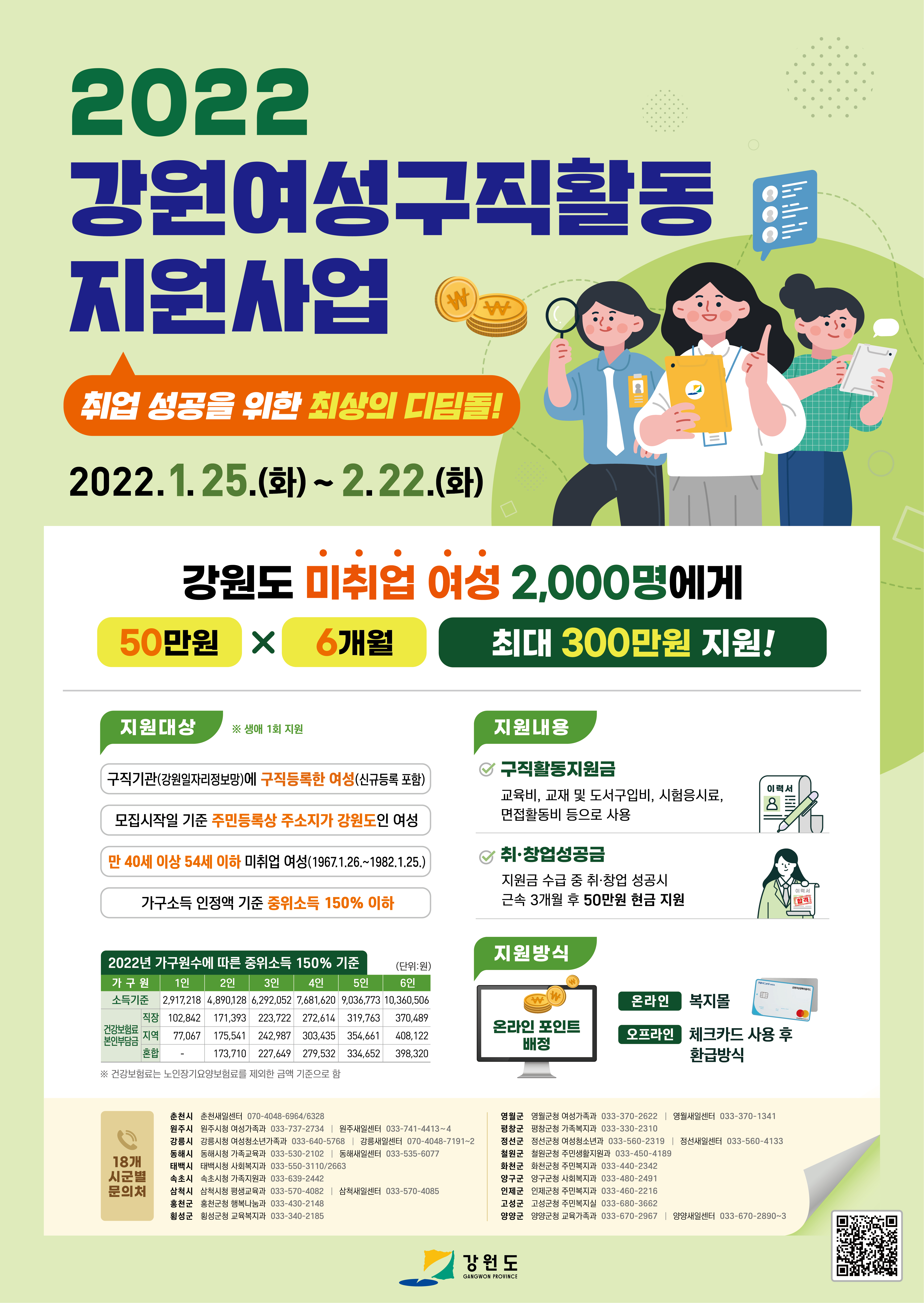 [강원사회복지신문 이정환 기자]=태백시는 여성의 경제활동 촉진과 경력단절 예방을 위해 '2022년 여성구직 활동 지원사업' 참여자 모집을 지난 2월 9일부터 시작해 오는 2월 22일까지 연장한다. 참여대상자는 1월 25일 기준 태백시에 거주하고 있는 만40세∼54세이하로 기준 중위소득 150%(4인가구 기준 7,681,620원) 이하에...