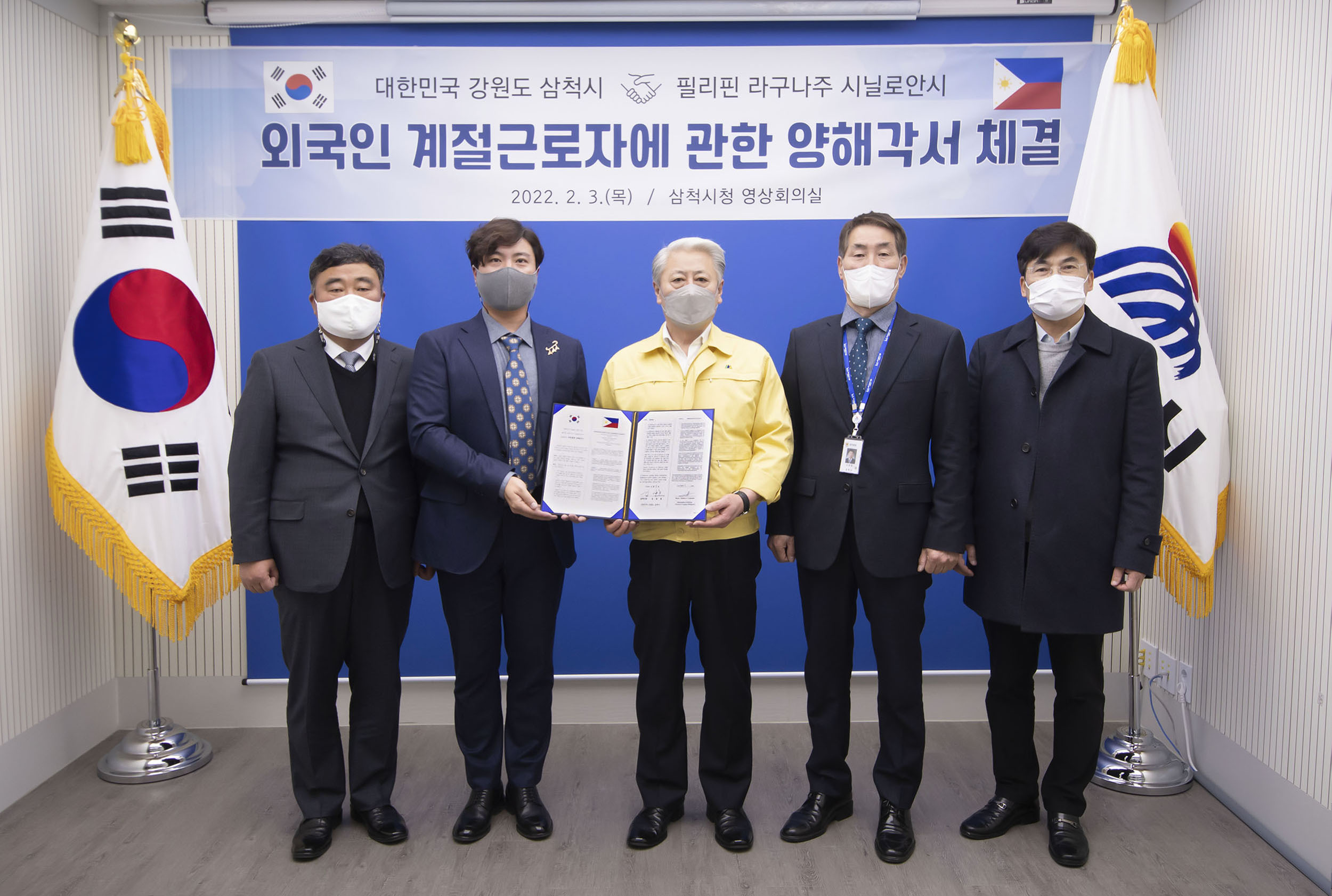[강원사회복지신문 김종한 기자]=필리핀 라구나주 시닐로안시와 업무협약 관내 15농가 51명 도입 예정 삼척시가 지난 2월 3일 오전 11시 시청 본관 3층 영상회의실에서 농업 경쟁력 향상과 농번기 일손 부족 해결을 위해 필리핀 라구나주 시닐로안시와 외국인 계절근로자 도입을 위한 업무협약을 체결했다. 이번 협약식은 코...