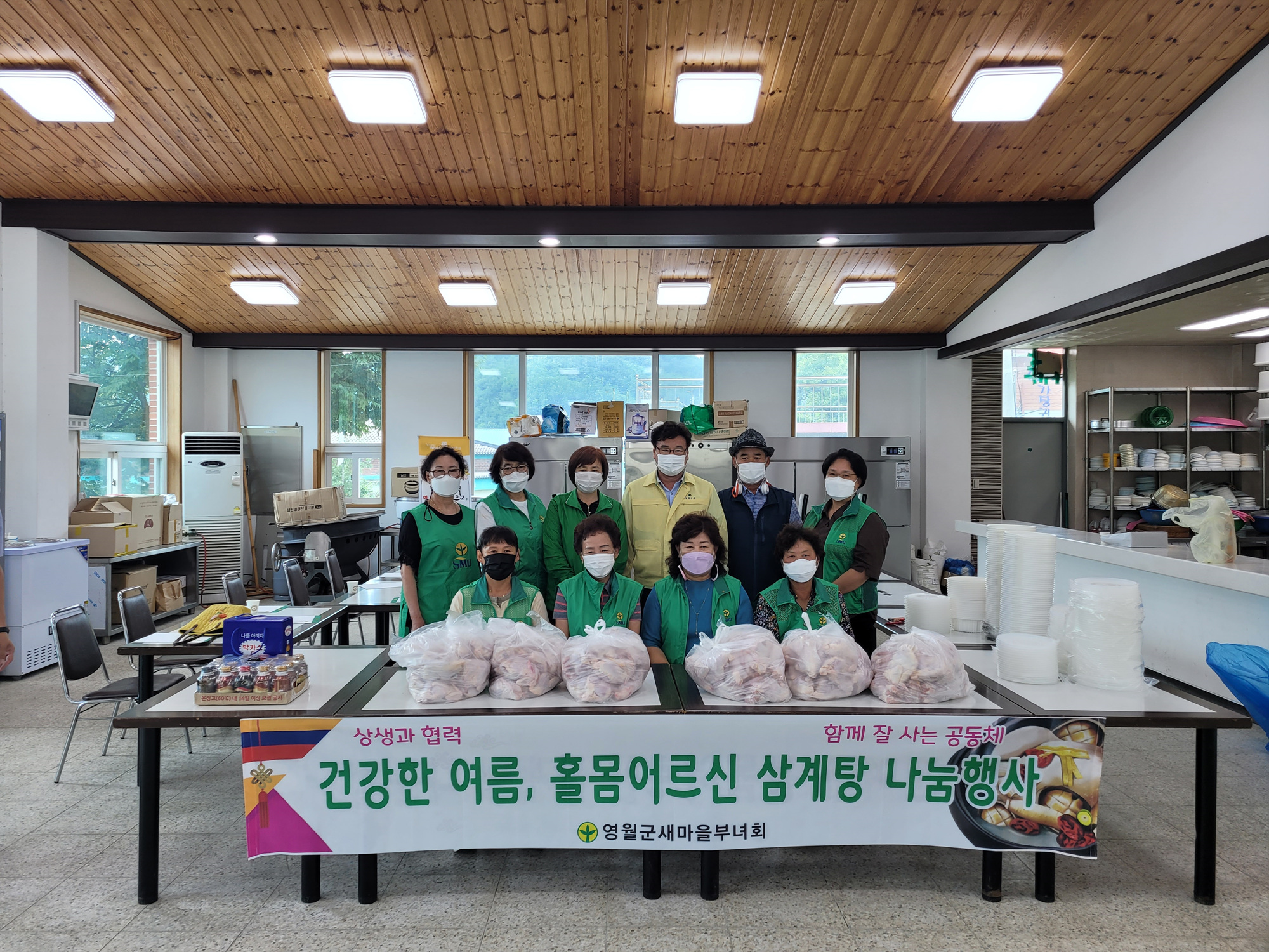 [강원사회복지신문 이정환 기자]=영월군 새마을부녀회에서 지난 7월 20일(수) 영월군 남면복지회관에서에서 홀몸어르신 삼계탕 나눔 행사를 가졌다. 이번 행사는 영월군새마을회 부녀회에서 관내 더운 여름을 홀로 지내야 하는 독거노인을 대상으로 중복맞이 삼계탕을 제공하고자 기획하였다. 새마을회 읍면회장(봉봉석)과 새...