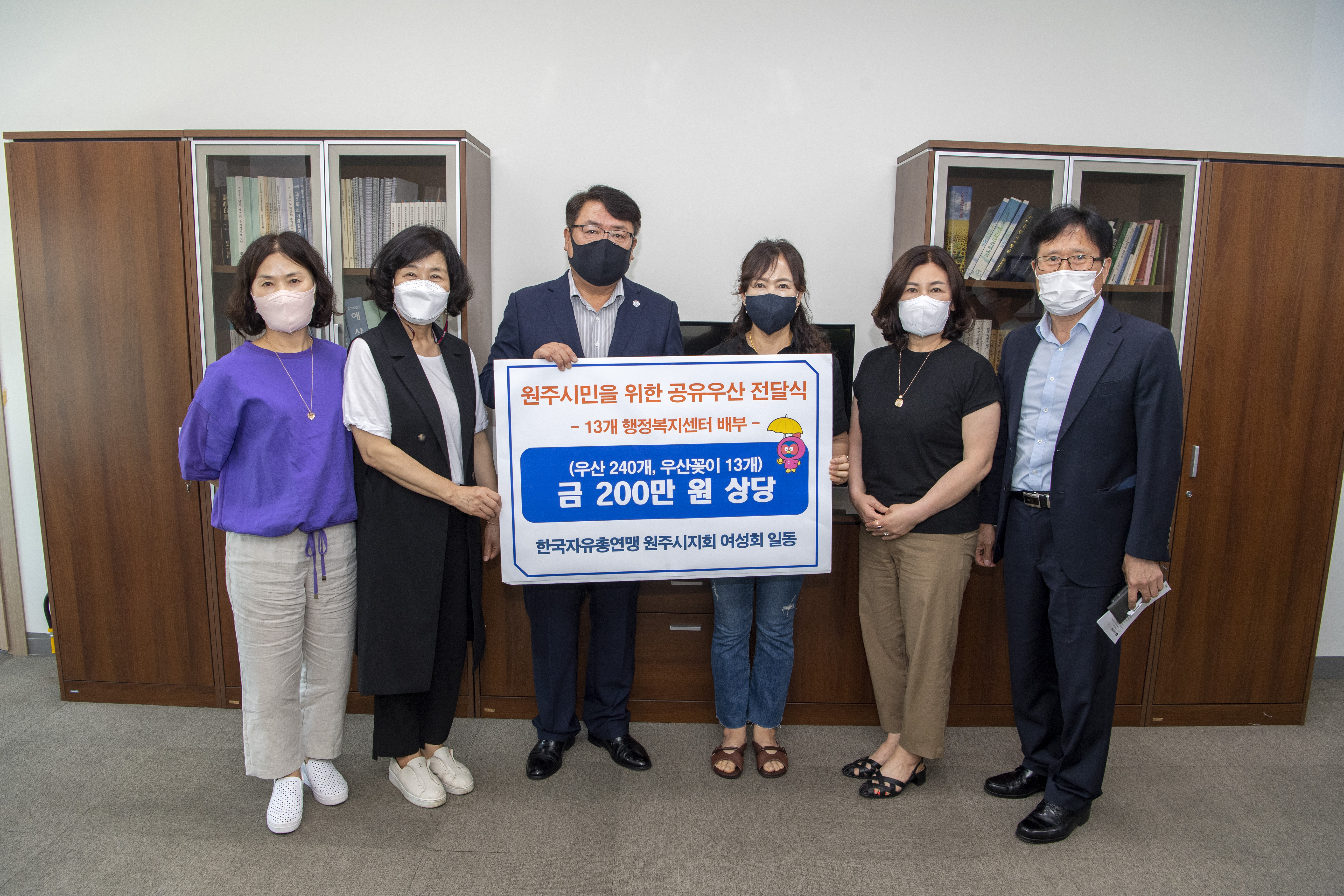 [강원사회복지신문 서은진 기자]=13개 행정복지센터에 우산 240개, 우산꽂이 13개 비치 예정 한국자유총연맹 원주시지회 여성회(회장 김인혜)는 지난 7월 21일 원주시에 200만 원 상당의 공유 우산을 전달했다. 이번에 후원된 공유 우산 240개와 우산꽂이 13개는 원주시 관내 13개 행정복지센터에 비치해 원주시민 누구나 무...