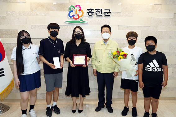 [강원사회복지신문 홍기한 기자]=허필홍 홍천군수는 지난 6월 14일 희망찬가족봉사단(단원 김인숙)에게 이달의 으뜸봉사상 가족부문상을 수여했다. 가족으로 구성된 희망찬가족봉사단은 환경정화활동, 연탄배달, 코로나19 방역활동, 홍천군 자체 마스크 제작 등의 봉사활동에 참여한 공로를 인정받았다. 사진은 왼쪽부터 정지...