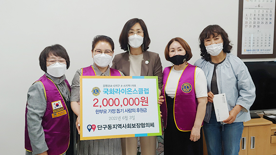 [강원사회복지신문 서은진 기자]=국화라이온스클럽(대표 이미자)은 지난 6월 3일 원주시 단구동 지역사회보장협의체 특화사업인 '코로나19 한부모 고용위기 가정 지원사업'에 후원금 2백만 원을 기탁했다. 성금은 코로나19로 고용위기를 맞은 단구동 관내 한부모 가정 10가구에 지원될 예정이다.