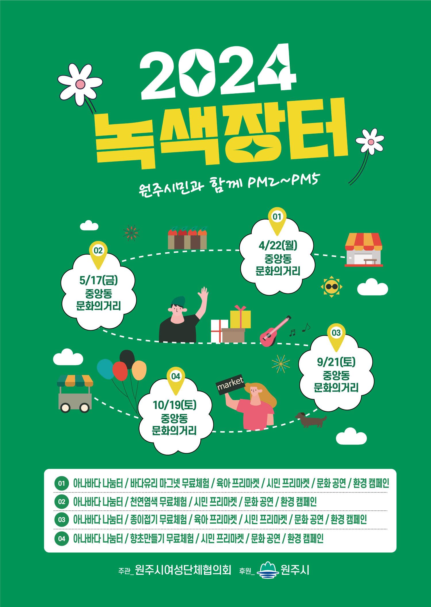 4/22, 5/17, 9/21, 10/19 원주시 중앙동 문화의거리에서 열려 원주시 여성단체협의회(회장 원은향)는 오는 4월 22일(월) 중앙동 문화의거리에서 자원절약의 녹색소비 문화 확산을 위한 “2024년도 원주시민 녹색장터”를 운영한다. 4월부터 10월까지 총 4회에 걸쳐 오후 2시부터 5시까지 열린다. 이번 행사는 아나바다 나눔터...