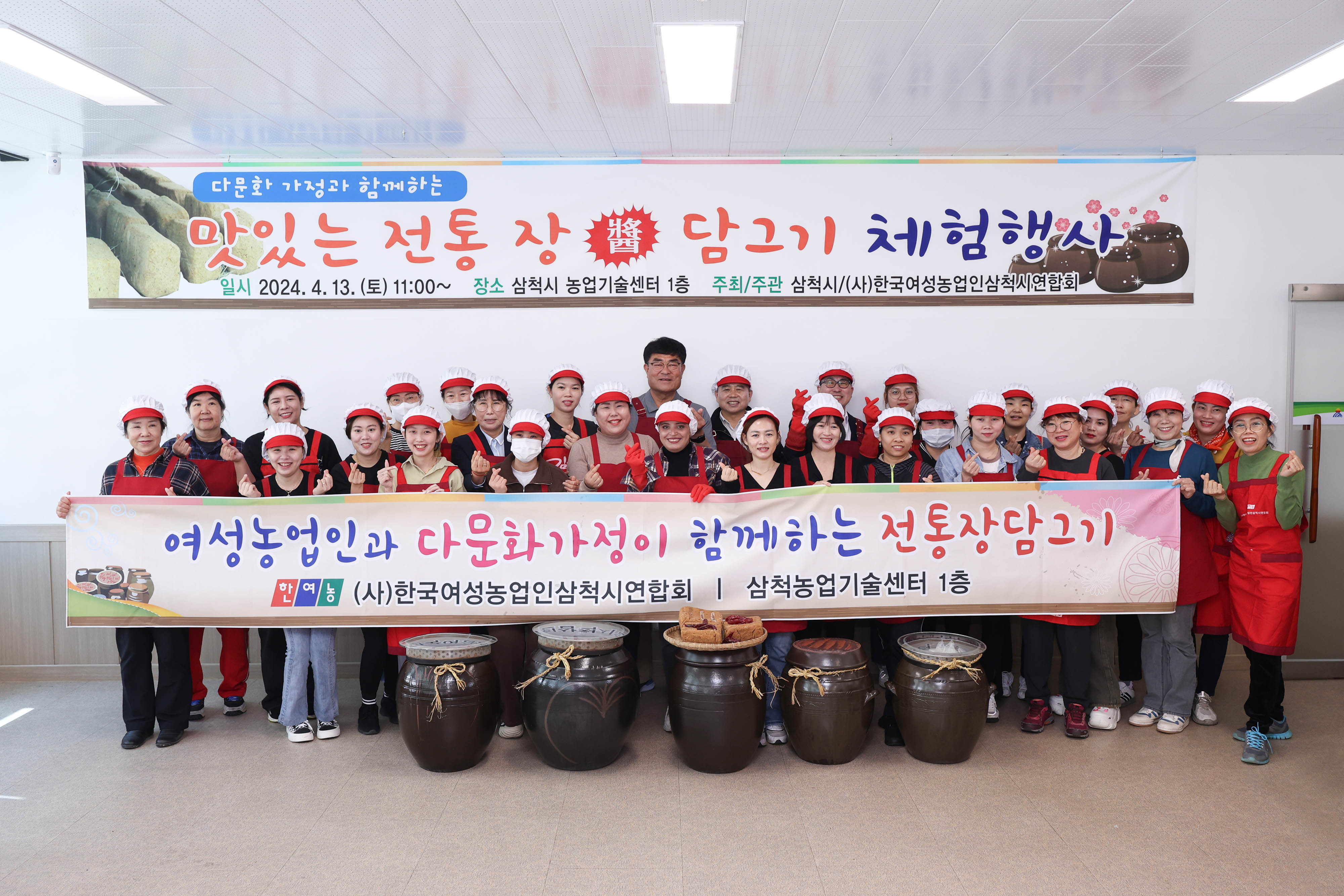 여성농업인 삼척시 연합회(대표 : 장혜란)에서는 지난 4월 13일 다문화 가정 초청 전통장 담그기 행사가 다문화 가족 등 100여 명이 참석한 가운데 개최됬다. 참가자들은 전통장 담그기 행사를 통해 다문화가족이 우리 문화를 쉽게 이해하고 공감하며 소통하는 기회를 가졌다. 또한, 본 행사를 통해 여성농업인과 함께하는 교...