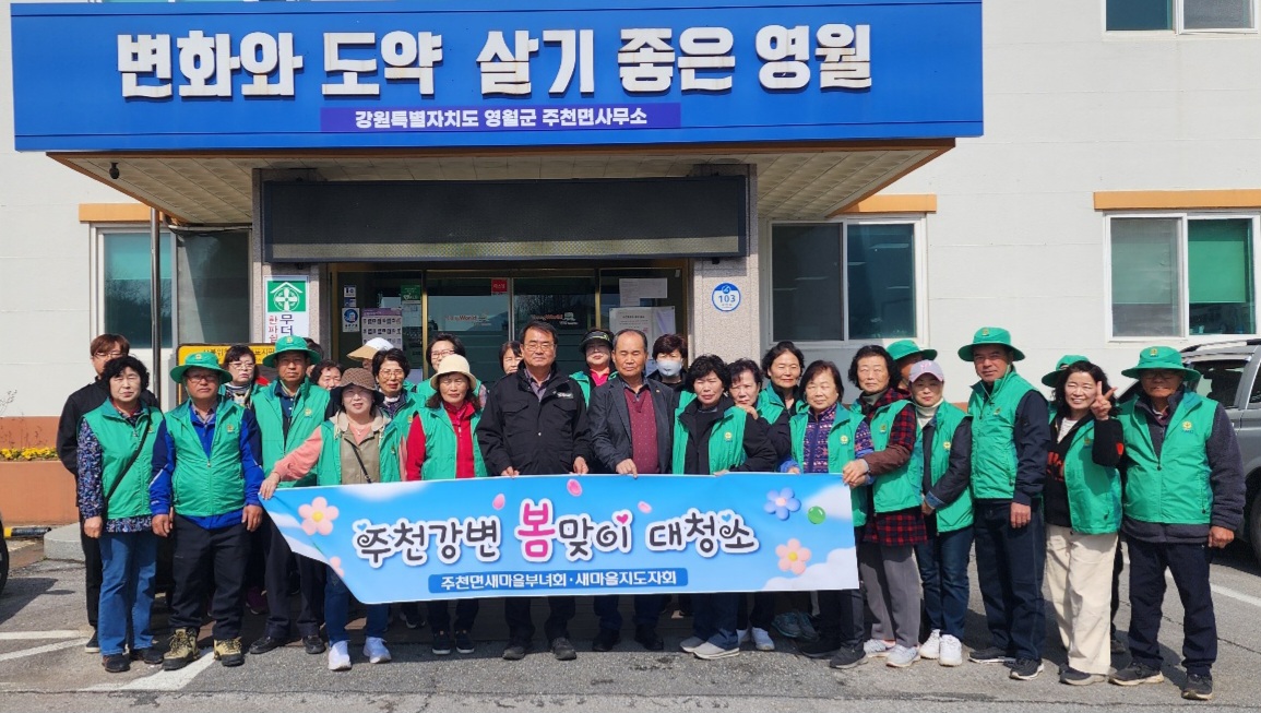 영월군 주천면 새마을부녀회와 새마을 지도자회는 지난 3월 27일 회원 40여 명이 참석하여 봄맞이 대청소를 실시했다. 이번 봉사활동은 쾌적한 환경을 조성하고 깨끗한 주천면의 이미지 제고를 위해 주천면 시가지 및 둔치 일대와 도로변에 불법투기 된 쓰레기를 중점적으로 청소하였다.