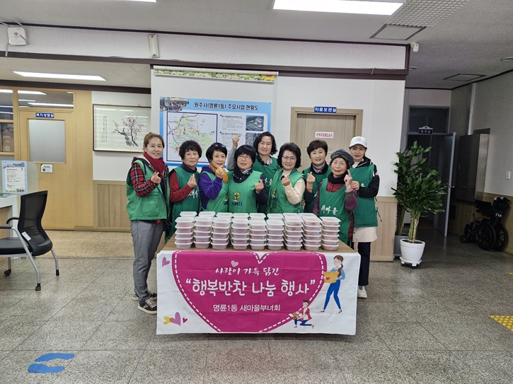 원주시 명륜1동 새마을부녀회(회장 윤성미)는 지난 3월 14일 독거노인 등 취약계층 30가구에 직접 만든 반찬을 전달하는 ‘사랑의 행복반찬 나눔 행사’를 진행했다. 윤성미 부녀회장은 “어르신들이 올 한 해도 건강하게 보내시길 바라는 마음으로 정성껏 반찬을 만들었다.”며, “행복한 지역사회를 위해 꾸준히 봉사할 수...