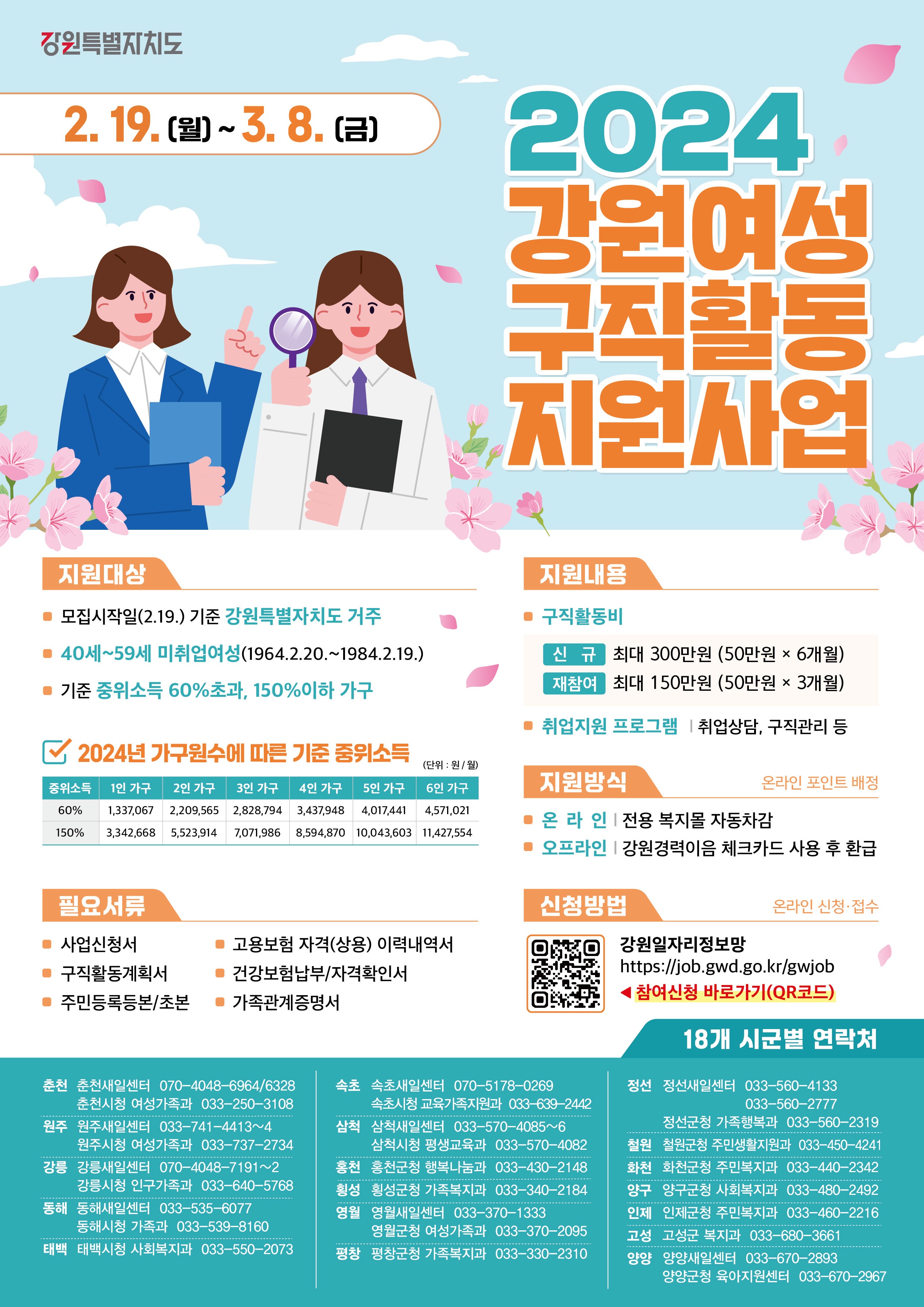 삼척시는 적극적인 구직의사가 있는 미취업 여성에게 안정적인 구직활동을 통해 재취업 등 경제 참여를 촉진하기 위하여 '2024년 여성구직활동 지원사업'을 추진한다. 신청기간은 2월 19일부터 3월 8일까지이며, 사업 신청은 강원일자리정보망(https://job.gwd.go.kr/gwjob)을 통해 회원가입 후 사업신청서 및 구비서류를 첨...