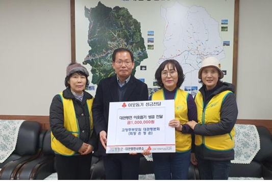 고향주부모임 대관령분회(회장 손정순)는 지난 2월 19일 오후 3시 어려운 이웃을 위해 사용해달라며, 성금 100만원을 평창군 대관령면에 기탁하였다.