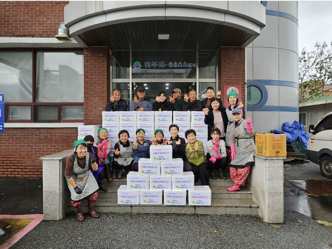 원주시 판부면새마을부녀회(회장 노순일)는 지난 11월 5일부터 7일까지 3일 동안 판부면행정복지센터와 원주 댄싱공연장에서 '사랑의 김장담그기' 행사를 실시했다. 이번 행사에는 판부면새마을부녀회와 판부면이장협의회가 함께 참여했으며, 총 100포기의 김장을 담가 관내 소외계층 46가구에 전달하였다. 노순일 판부면새마...